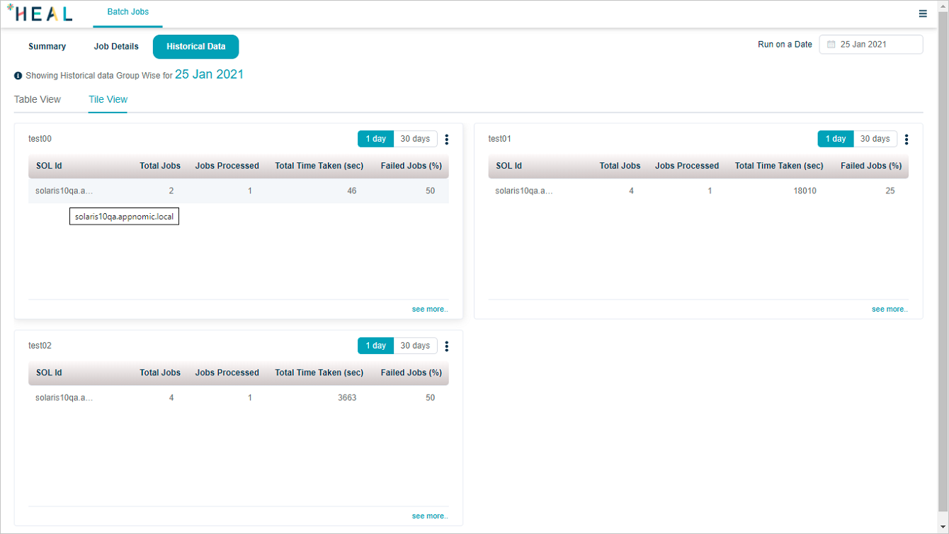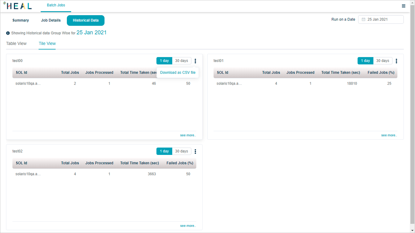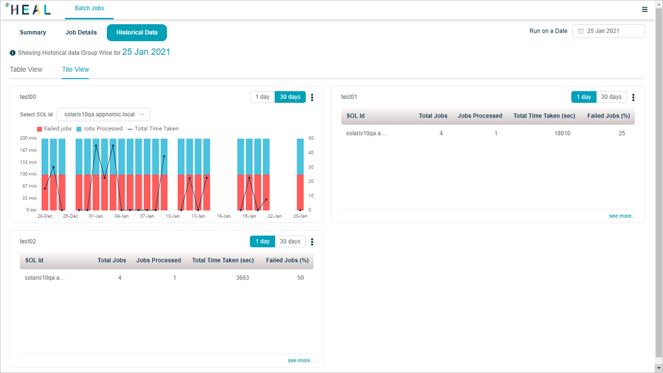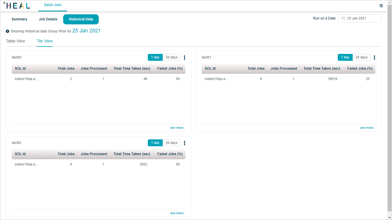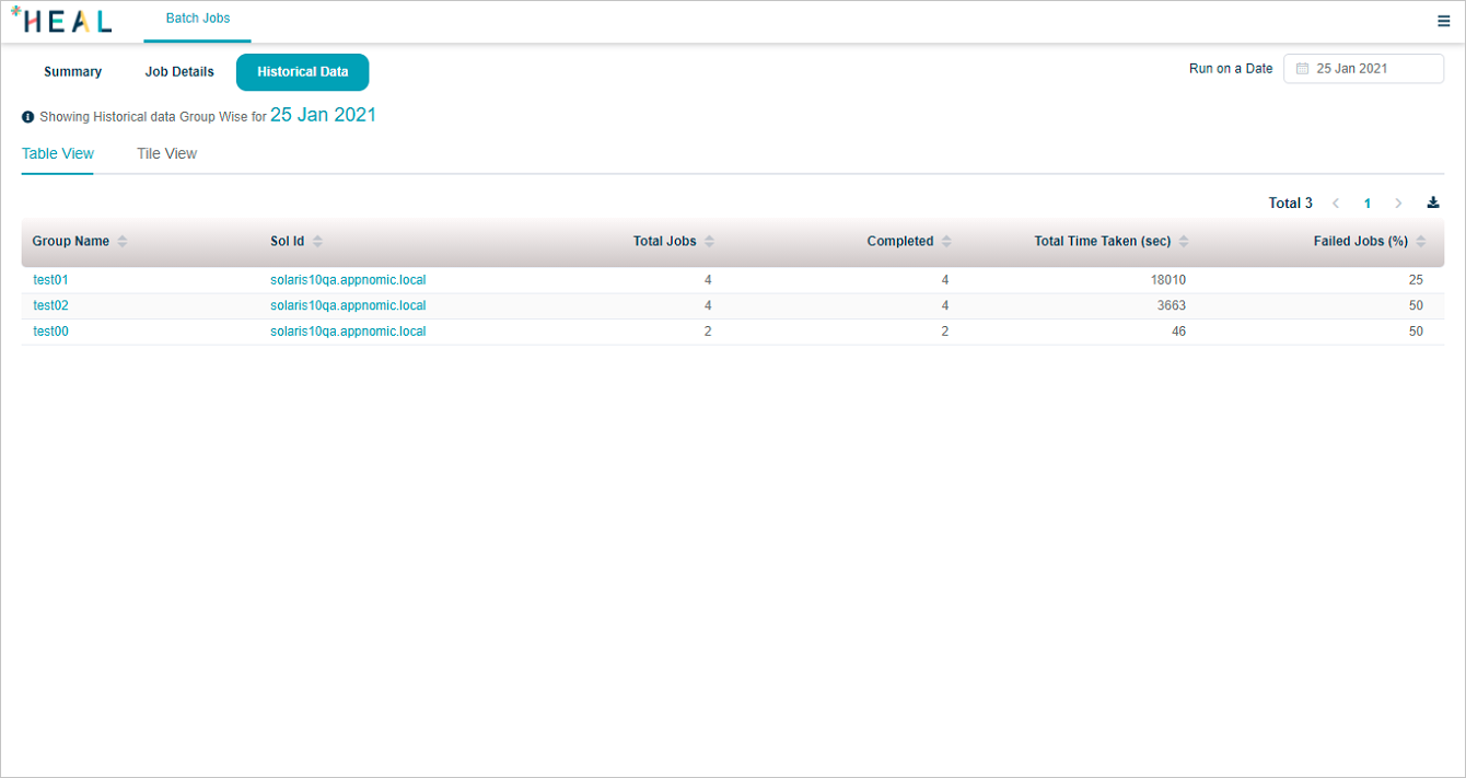 There are two views in which you can see the historical data for jobs – Table View and Tile View.