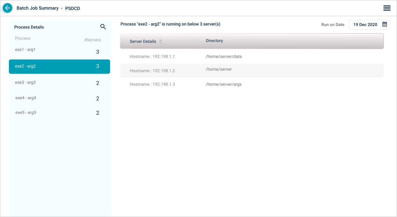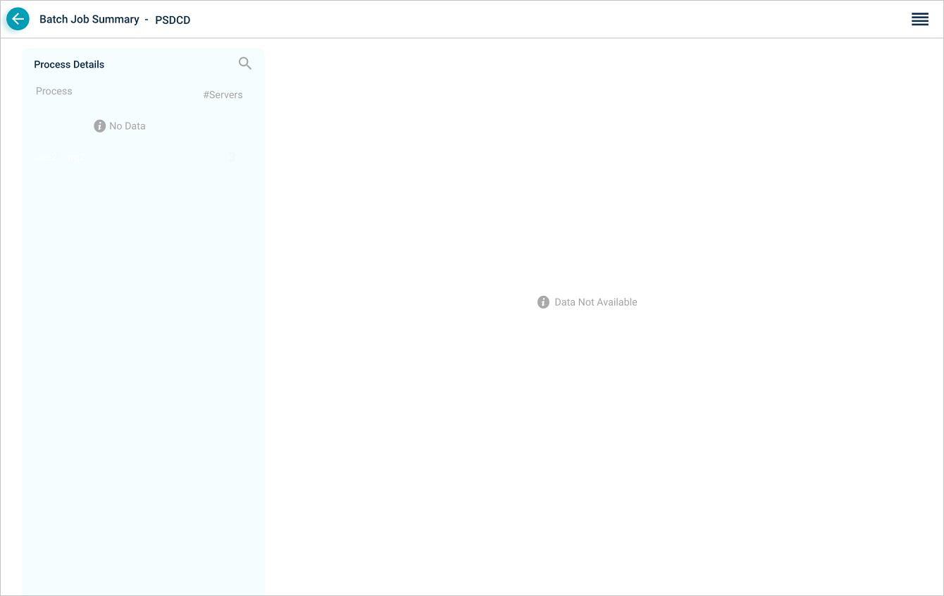 Select on a job id in Job Details screen to view the process details associated with the job. A process can have arguments. Process Details section displays process name, arguments for the process, and the number of servers on which the process executes. Select on a process to view the details and the paths of the servers.