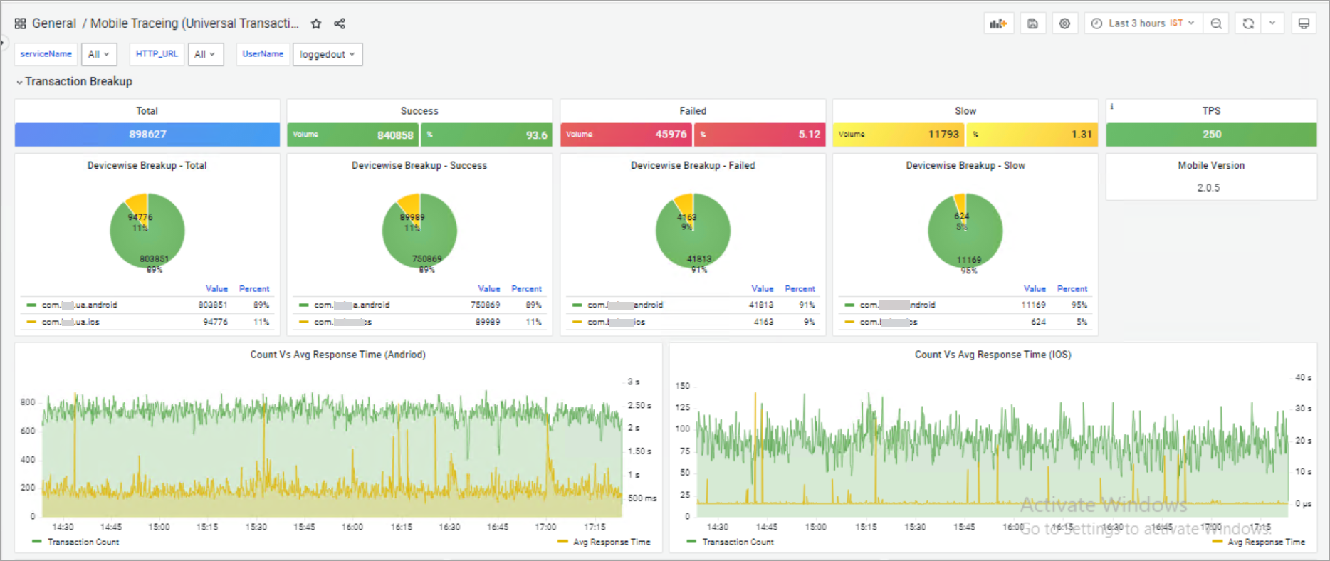 - Count Vs Avg Response Time (Android)” and “Count Vs Avg Response Time (iOS): These graphs compare the number of transactions (Count) over time against the average response time (Avg Response Time) for each respective service.