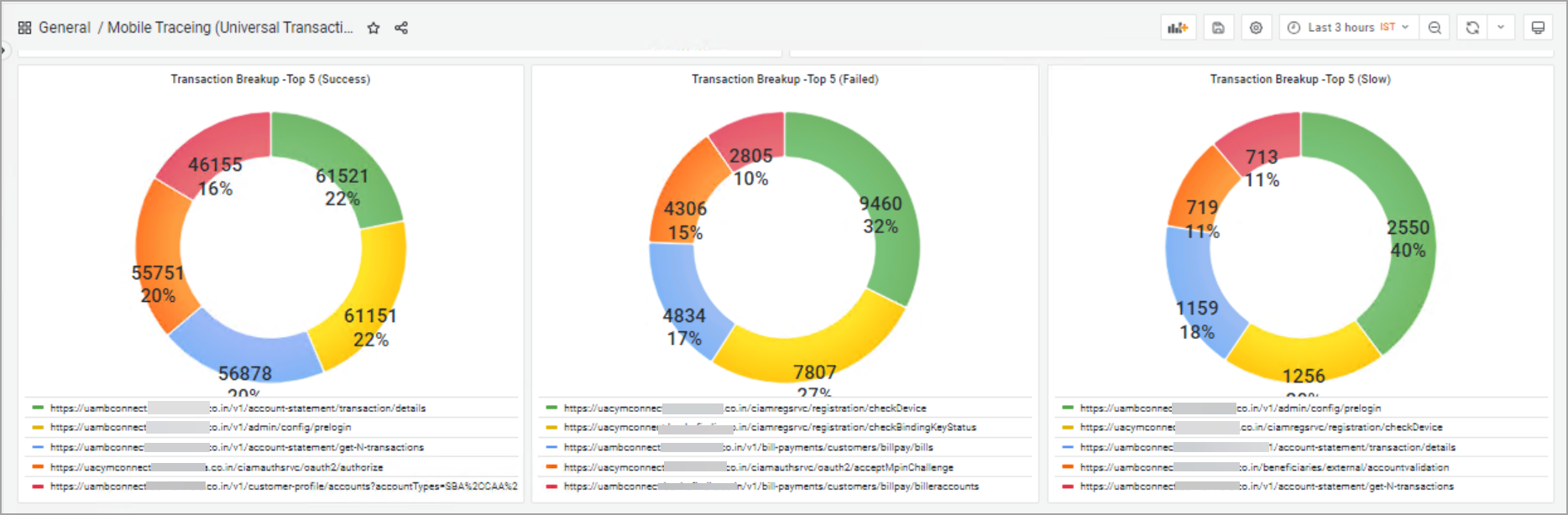 - Transaction Breakup – Top 5 (Failed): This chart represents the top 5 failed transactions. Similar to the success chart, each slice shows the failure rate for a given URL or service endpoint. The percentage signifies the proportion of total failures, and the labels provide context for each type of failure.