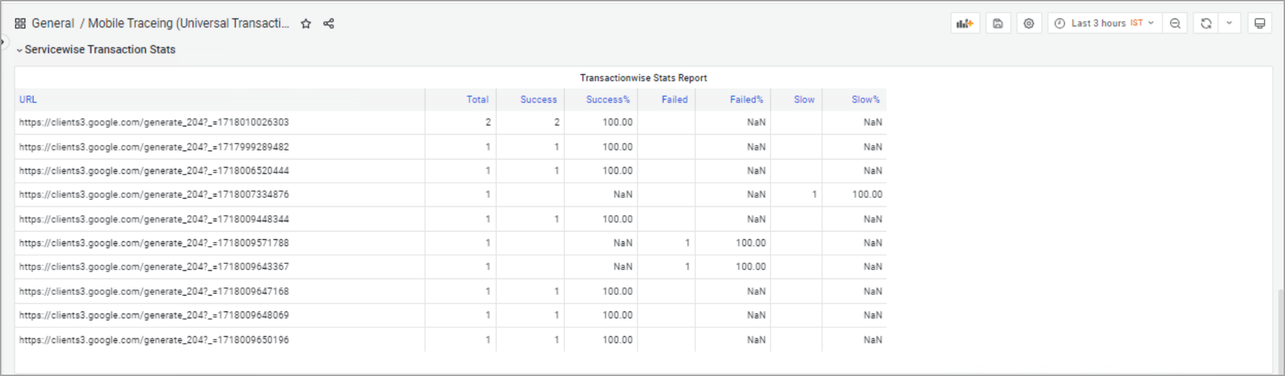 - Slow%: Depicts the percentage of slow transactions against the total transactions per URL. It helps in identifying performance bottlenecks.