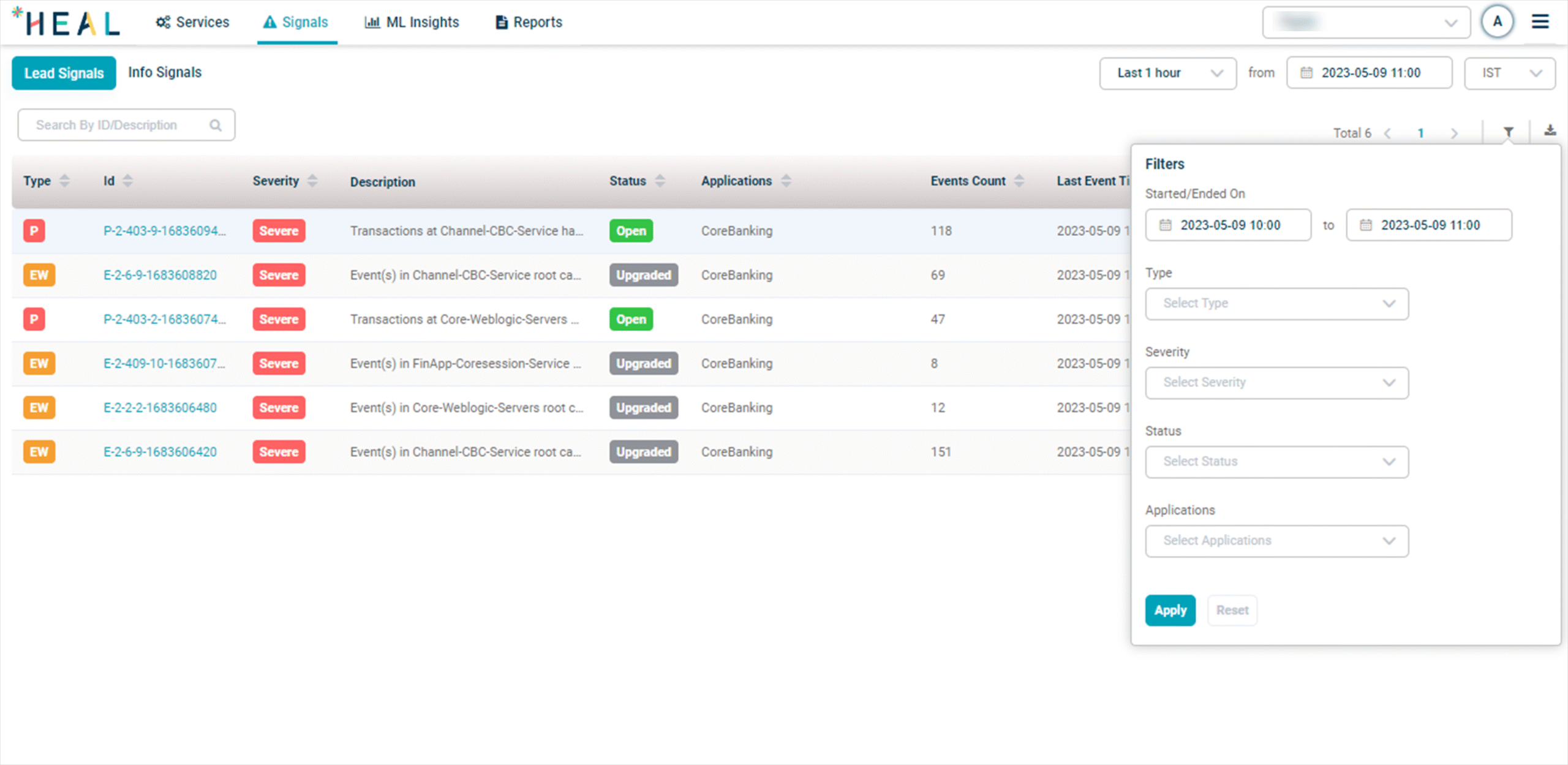 • Filter signals based on criteria such as timestamp, type, severity, and status
