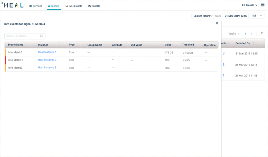 [box type=”info”] Info and Lead Signals are mutually exclusive. There can be one Info Signal per Info metric category per service at a time. If HEAL detects multiple metric events on the same metric category and service at 12 PM, it generates only one Signal, with all the events being part of the same Signal. If HEAL detects more events on the same metric category and service at 12:01 PM, it generates another Signal, with all new events being part of the new Signal.[/box]