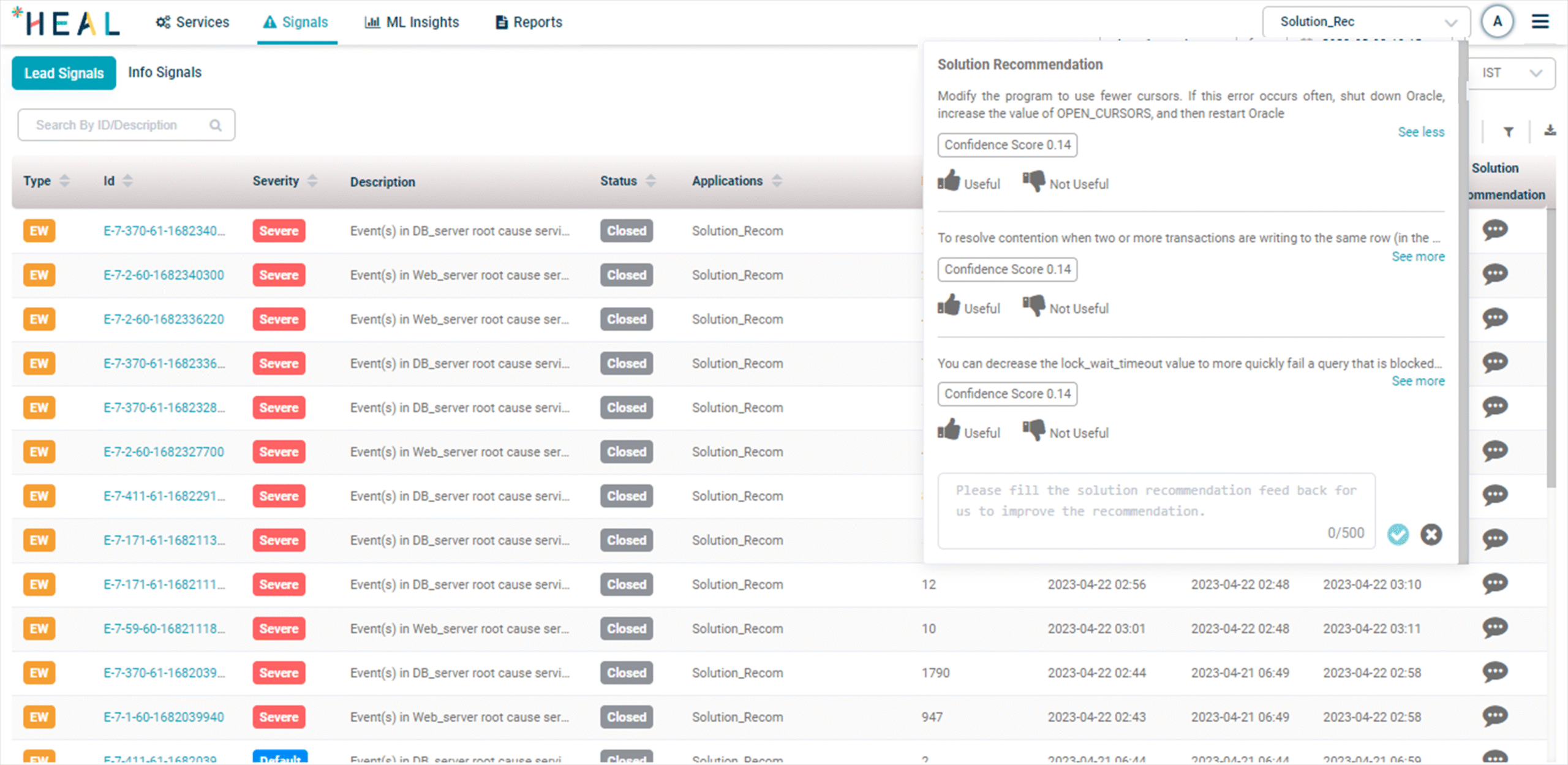 15 – Solution Recommendation Displays the top three potential solutions for addressing the root cause of a generated Signal (Problem or Early Warning), allowing users to quickly assess and address the issue while providing a platform for feedback on the effectiveness of the proposed solutions. Solution Recommendation
