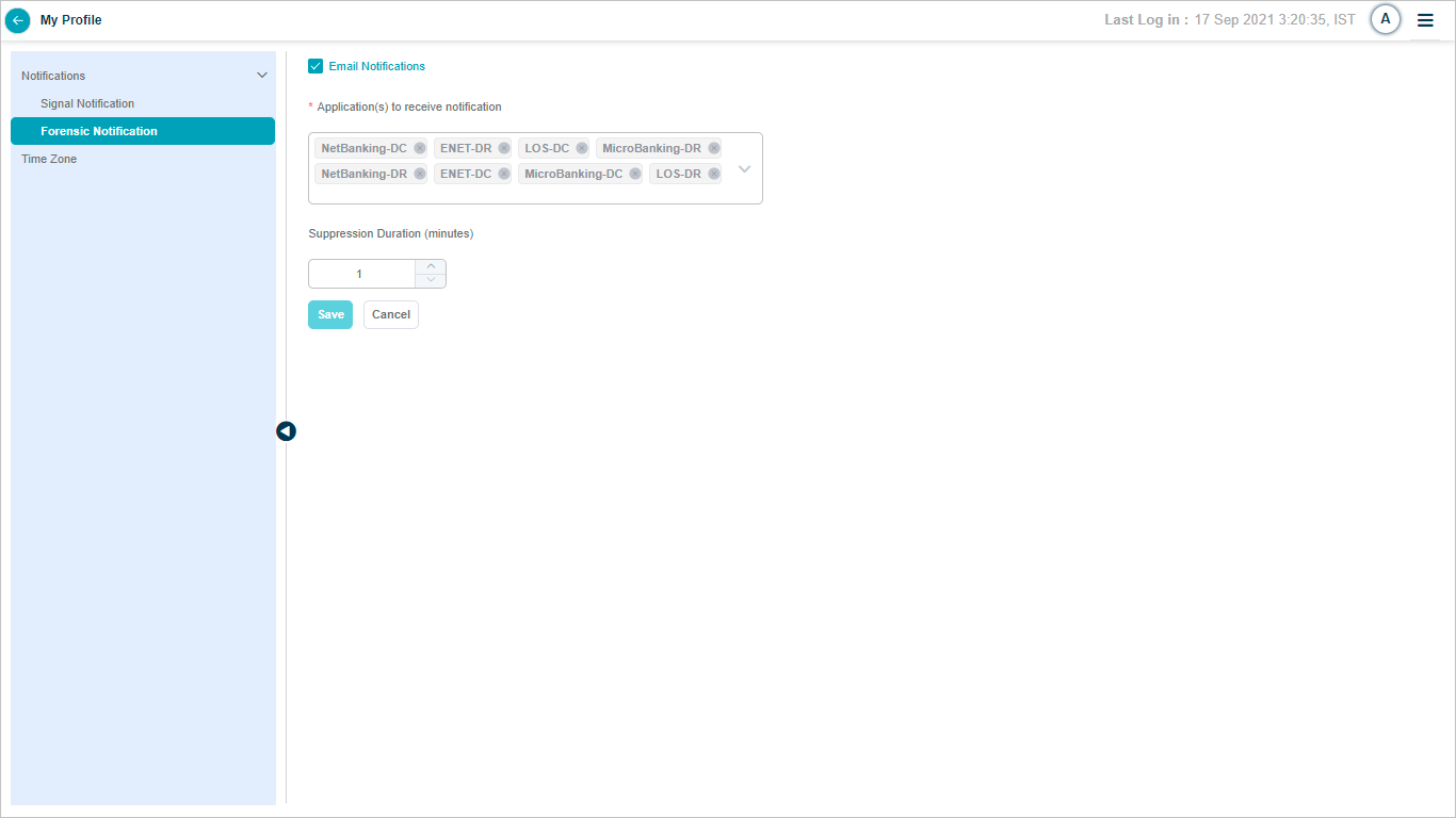 You can enable or disable the forensic notifications. Select the applications for which you require the email notifications if HEAL generates forensics. Enter the suppression duration in minutes. This indicates the time interval between two forensic emails which HEAL sends to the user. HEAL triggers the forensic notification emails to the users only when you enable the notification.