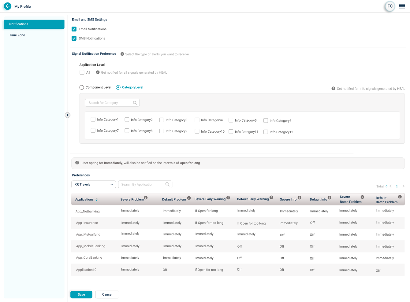 | 6 | Choose a notification preference for a Severe Info Signal occurring in the application. |