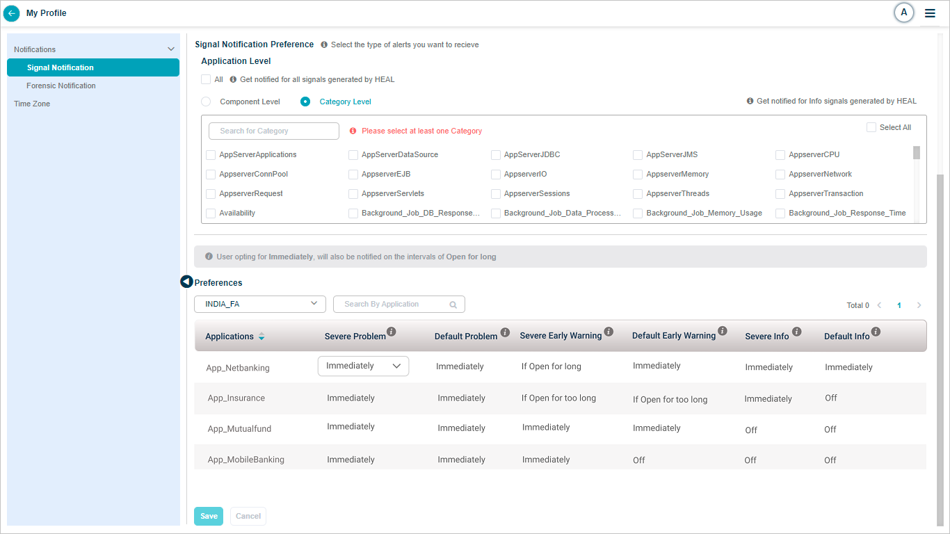 | 5 | Select Component Type, Component Name or Instance Level, to receive the notifications HEAL generates for Lead Signals. Select Category Level to receive the notifications HEAL generates for Info Signals. Whichever option user selects, it is applicable to all the applications assigned to the user. When admin creates a user, HEAL assigns the user preference by default to Application level. |