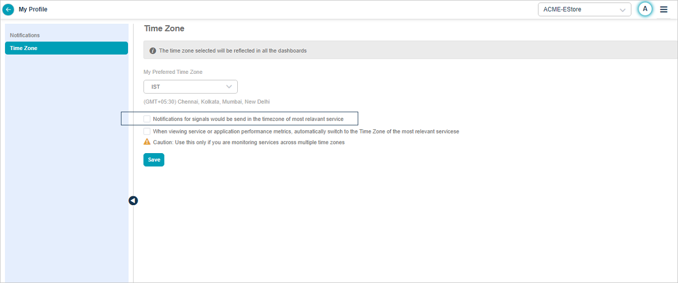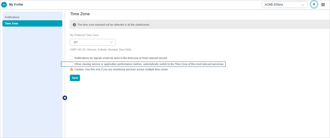Select Time Zone. My Preferred Time Zone drop down lists all the time zones. First entry in the drop down displays default time zone for the account. This is the default time zone for every new user. You can set a preferred time zone for yourself. This time zone gets automatically reflected in all HEAL dashboards. Following screens display time-series data in your preferred time zone.