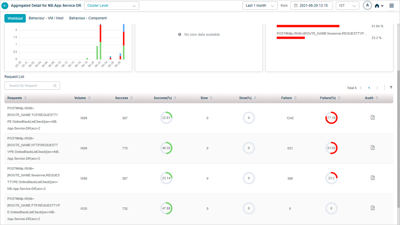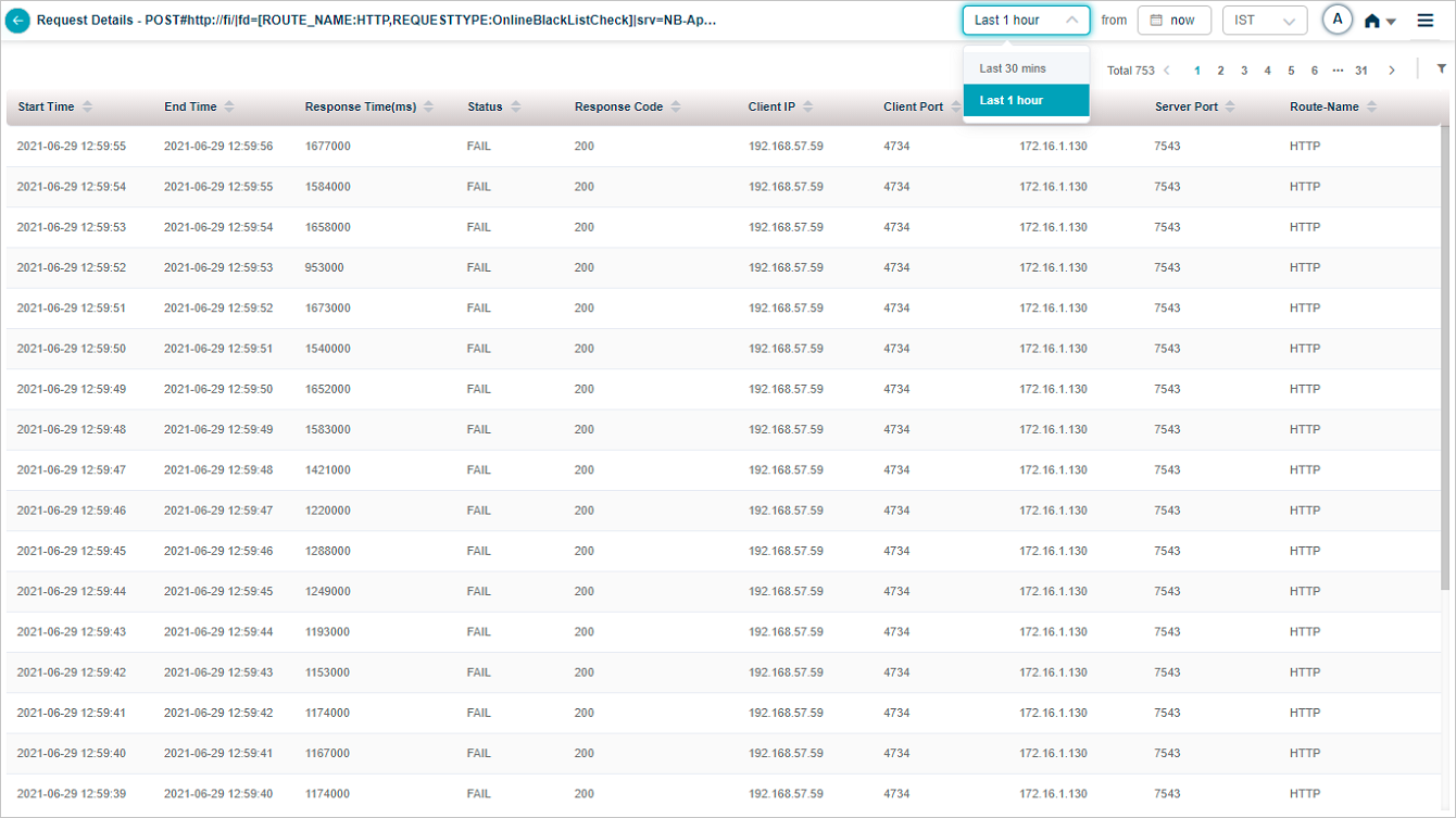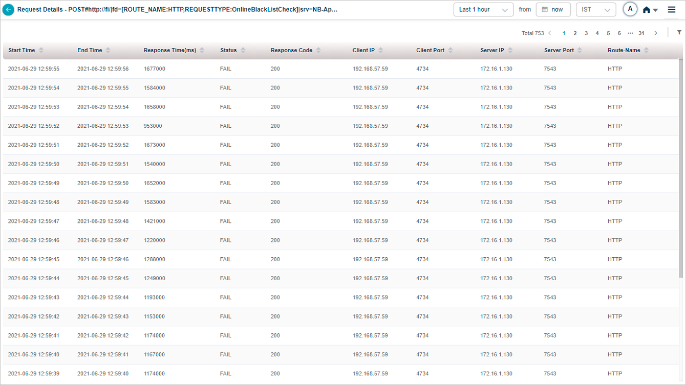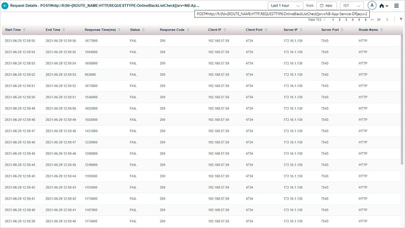 Select View Transaction Audit. HEAL displays following screen. Client and Server exchange request and responses. Whatever captions you provide in ‘Display Name’ fields in Control Center UI, those captions are the column headings in HEAL UI in ‘Request Details’ screen. Actual values for the fields specified in GET/POST Variable(1) boxes in Control Center UI appear under these column headings in HEAL UI in ‘Request Details’ screen.