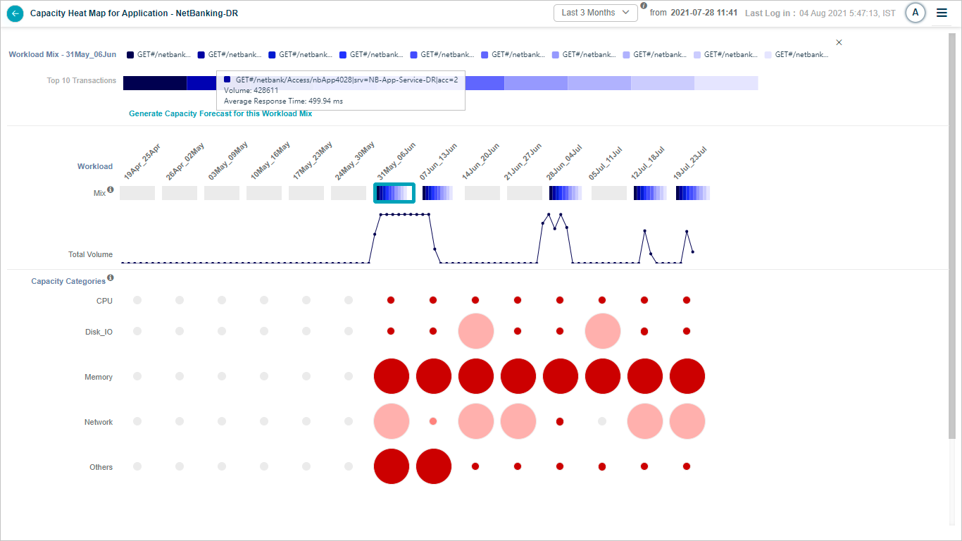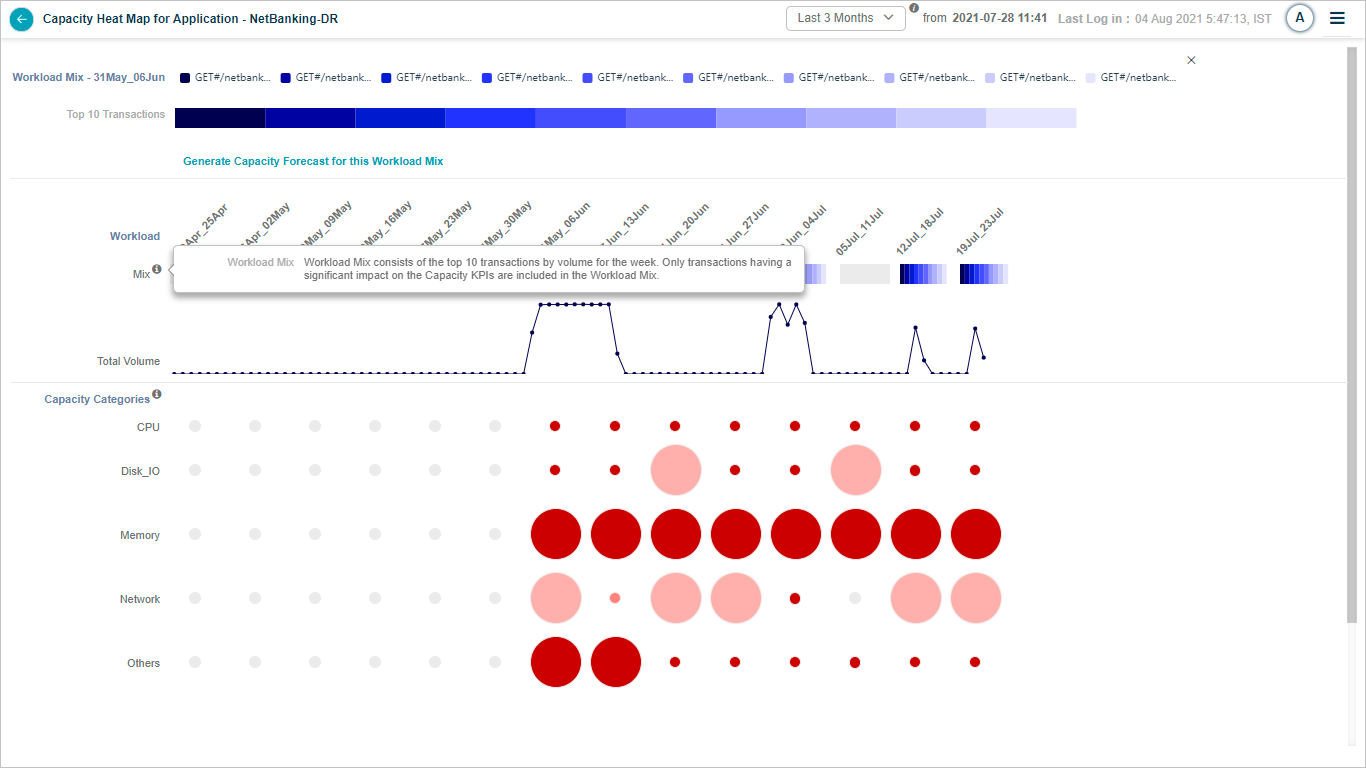 7. Transaction Mix Selection: You can select a specific transaction mix for in-depth analysis during a particular week. This will display the top ten transaction names in a stacked bar graph for the selected week. Hovering over a transaction will display the average weekly volume for the specific transaction. It will also display the average response time in milliseconds for the transaction.