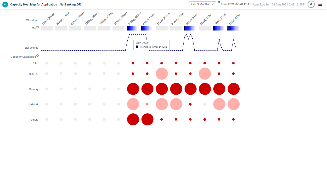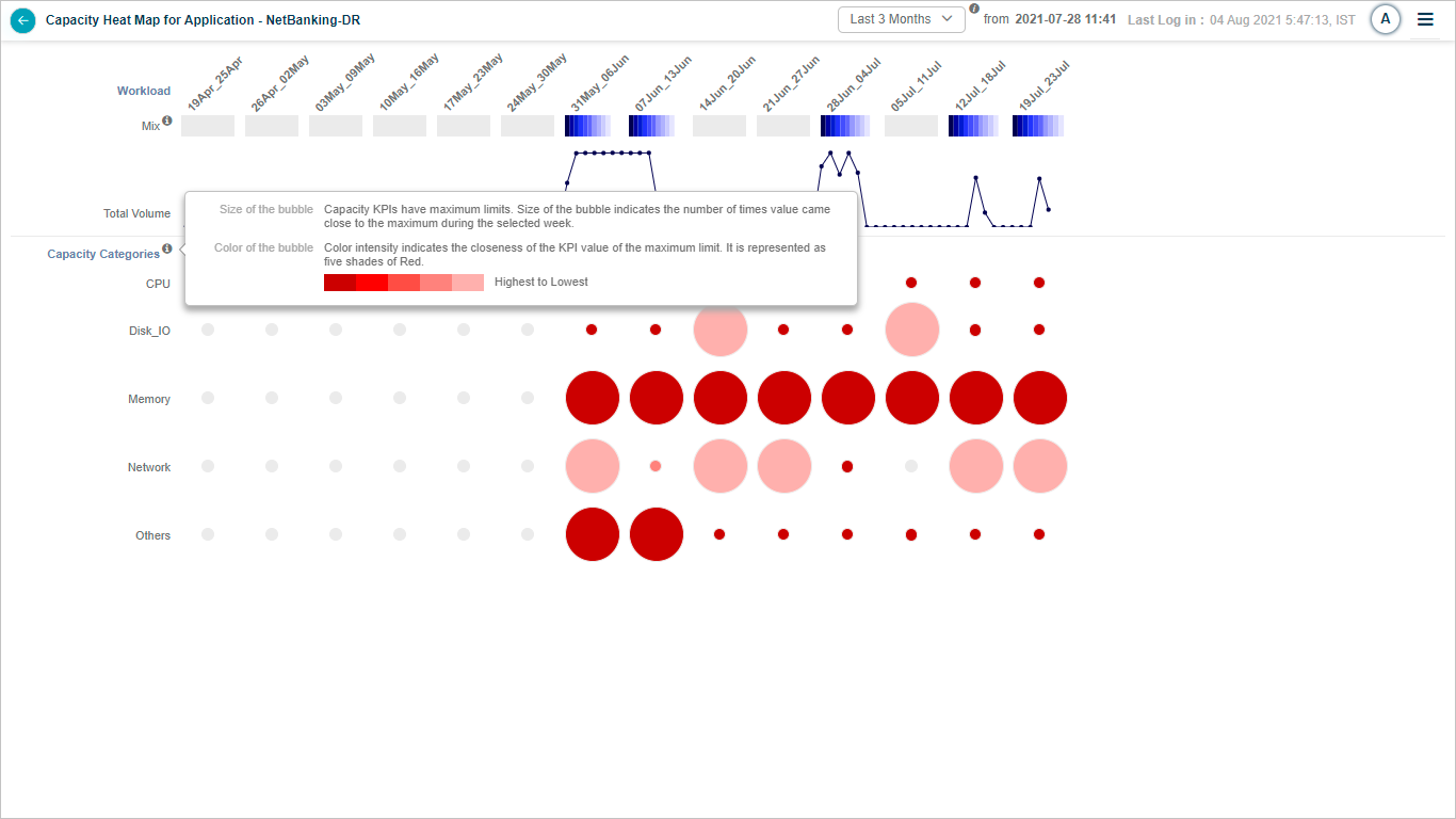 | 4 – Bubble Size in Capacity KPIs | The size of the bubble in Capacity KPIs indicates the frequency, i.e., the number of instances when a KPI value approached its maximum limit within a week. Capacity KPIs have predefined maximum and minimum boundaries. When you hover over a bubble, HEAL presents five frequency ranges or ‘buckets.’ The first bucket represents the most severe frequency, while the last denotes the least severe. |