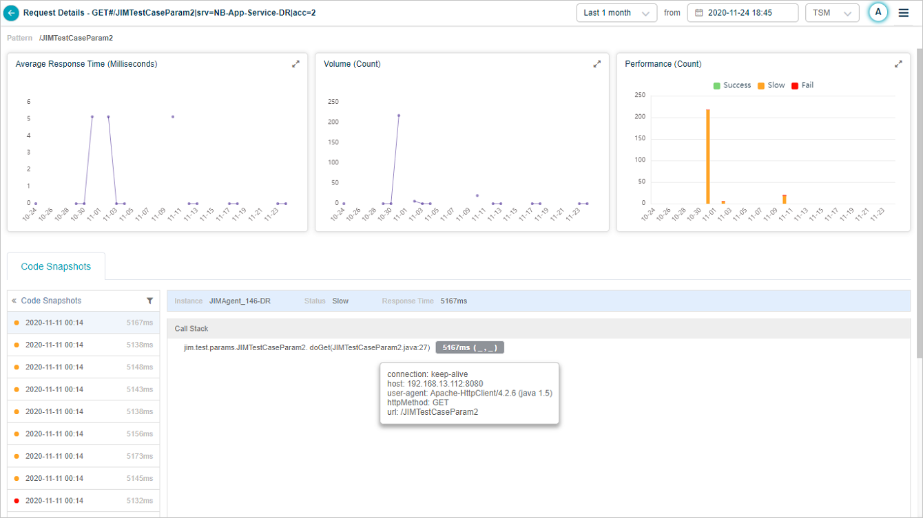 If Java Intrusive Monitoring (JIM) is configured for a Service, code snapshots are displayed whenever a request slows down or runs into technical errors.