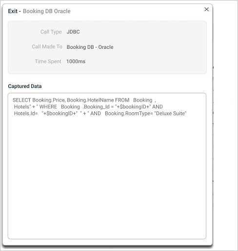 | 10 | Exits are marked in Blue. Select on the exit to view the parameters passed into it. It shows time spent in Exit and the call type. It displays data sent to exit according to the type of exit. Captured Data displays queries executed by the Exits. |