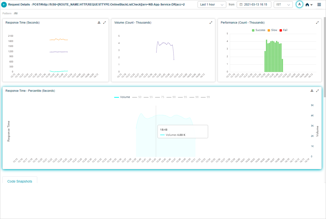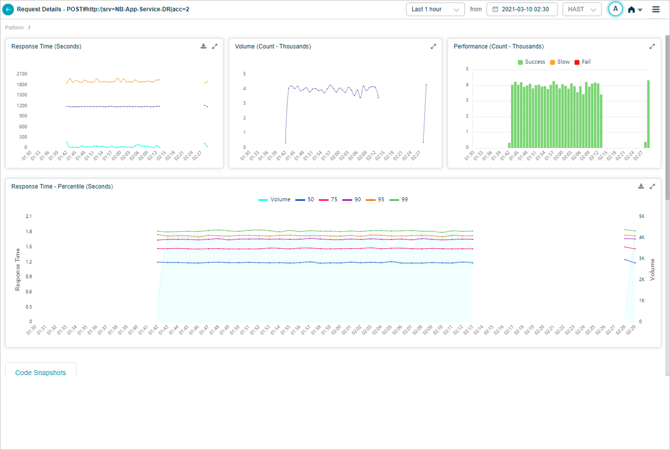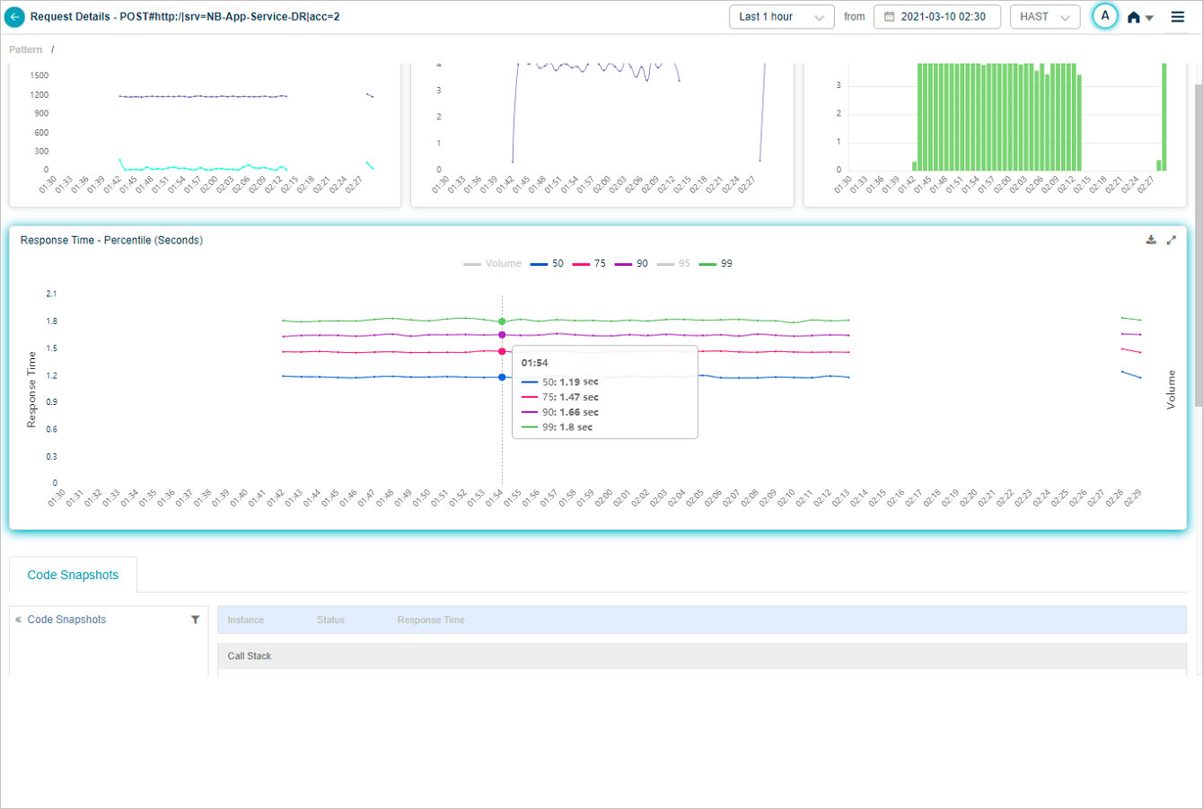Response Time – Percentile pod displays the response time of the request in percentile value. HEAL displays five percentile values by default – 50, 75, 90, 95, 99. Administrator can configure the percentile values in Control Center at application level. HEAL allows maximum five percentile values for an application. If a service belongs to multiple applications, HEAL displays unique percentiles for all these applications. Response Time graph is visible only when HEAL identifies success and slow requests. If only failed or unknown requests are available, HEAL doesn’t display any data in Response Time graph. Volume graph is visible in both these cases. Hover on a data point in Response Time graph to view the total number of incoming requests for an instance in time and the response time in seconds for individual percentiles. Select