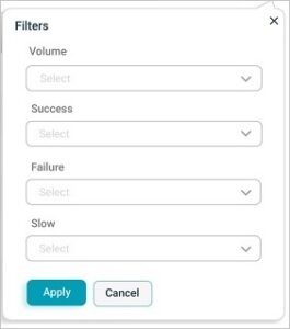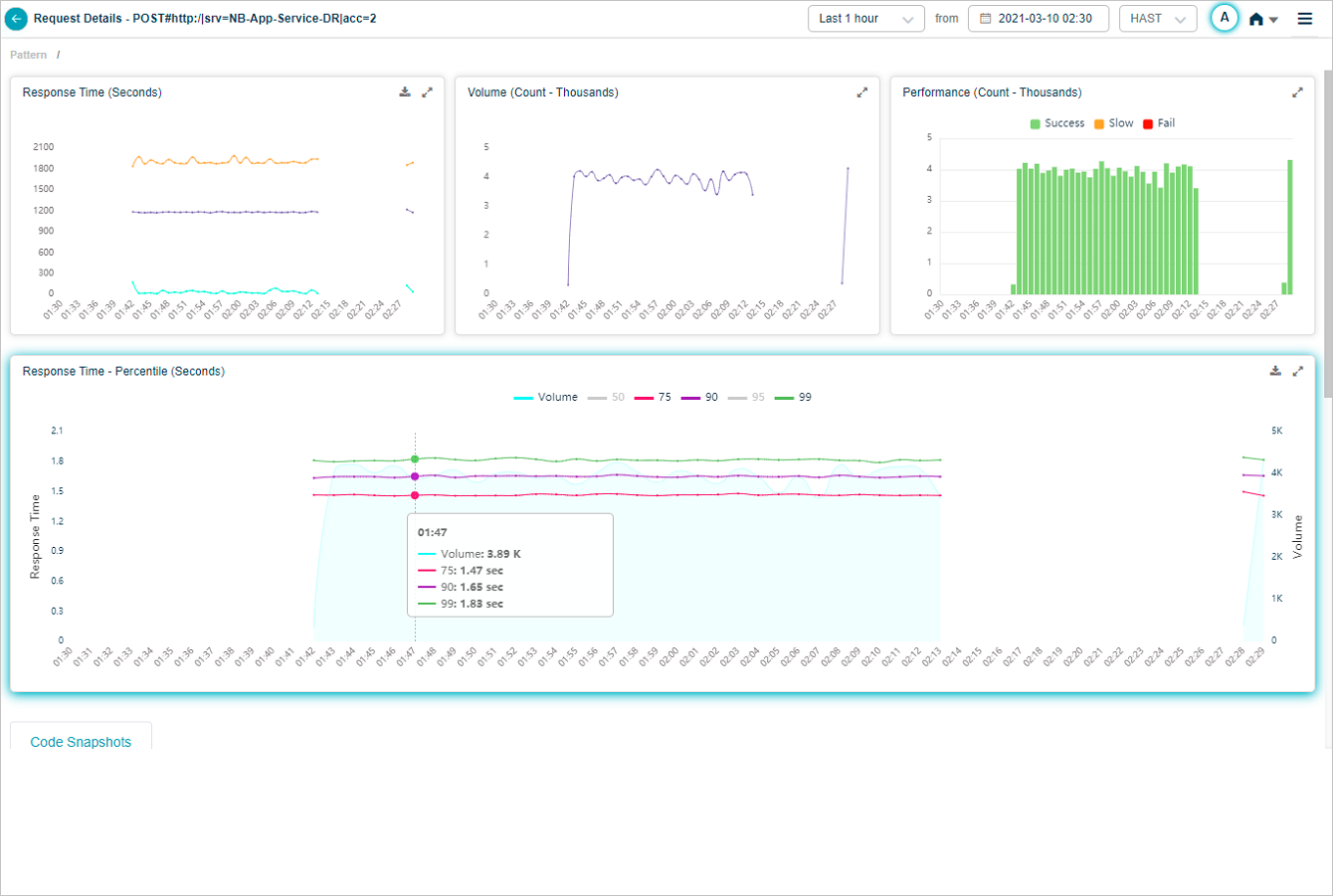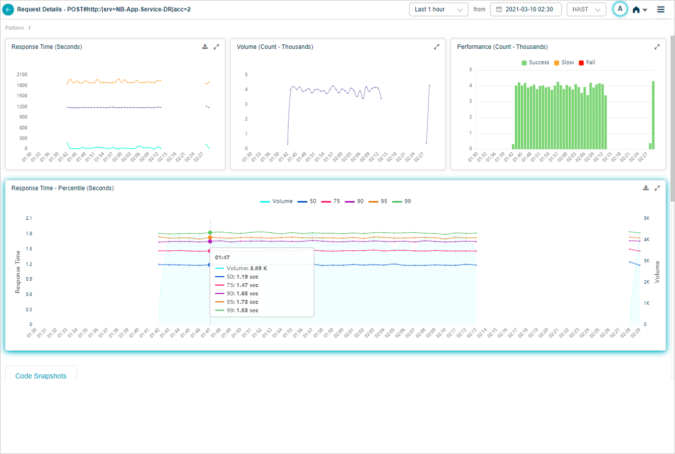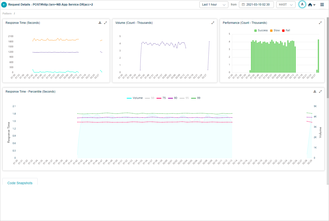 Response Time – Percentile pod displays the response time of the request in percentile value. HEAL displays five percentile values by default – 50, 75, 90, 95, 99. Administrator can configure the percentile values in Control Center at application level. HEAL allows maximum five percentile values for an application. If a service belongs to multiple applications, HEAL displays unique percentiles for all these applications. Response Time graph is visible only when HEAL identifies success and slow requests. If only failed or unknown requests are available, HEAL doesn’t display any data in Response Time graph. Volume graph is visible in both these cases. Hover on a data point in Response Time graph to view the total number of incoming requests for an instance in time and the response time in seconds for individual percentiles. Select