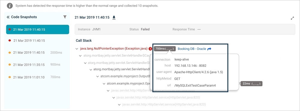 | 5 | This displays a list of code snapshots for a specific request in reverse chronological order on the time they were collected. It also displays response time of the request instance, the component – Java Virtual Machine (JVM) which processed the request and status. Each snapshot corresponds to an instance of the request. It displays snapshots of slow or failed requests only (failed – red, slow – orange) along with the date and timestamp for the snapshot. By default, first snapshot in the list is selected. |
