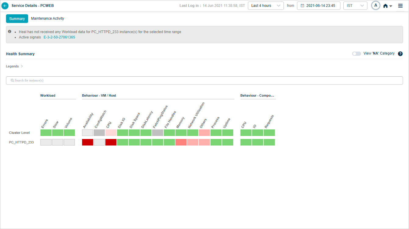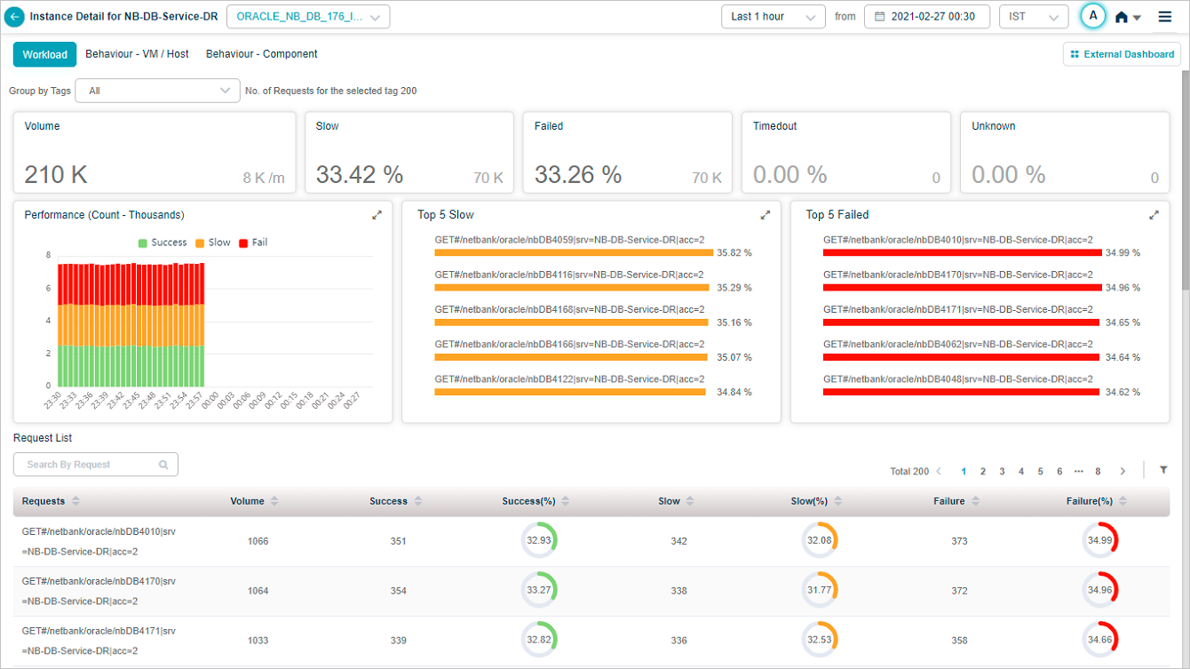 Request Dashboard at Instance Level appears when you select on any of the workload metrics (Errors, Slow, and Volume) for an instance in Service Details screen.