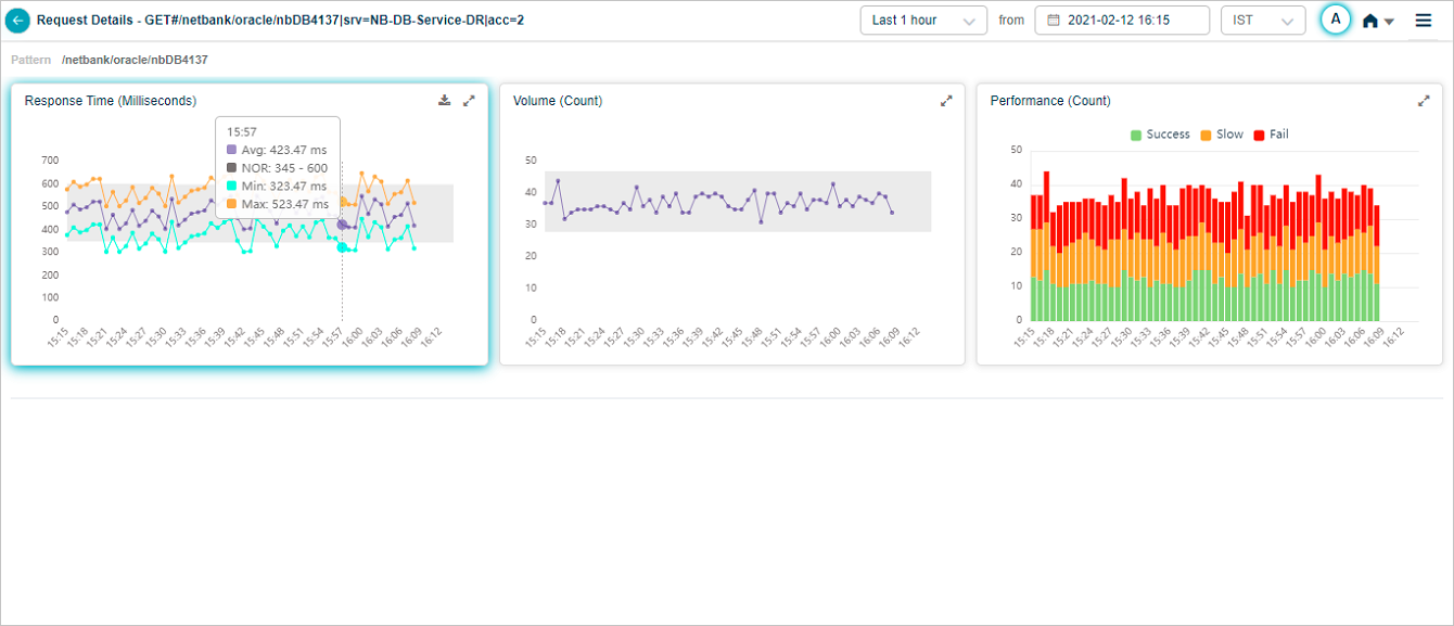 Hover on a data point in Response Time pod to view average, maximum, and minimum response time for the request at a specific instance in time. Instances of a transaction can have different response times. Min indicates minimum response time among these instances. Max indicates maximum response time among these instances. Avg indicates average response time of these instances.