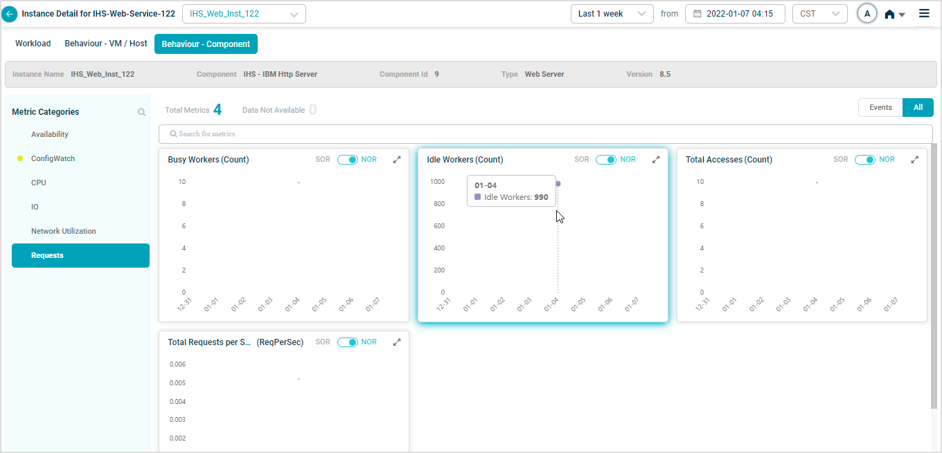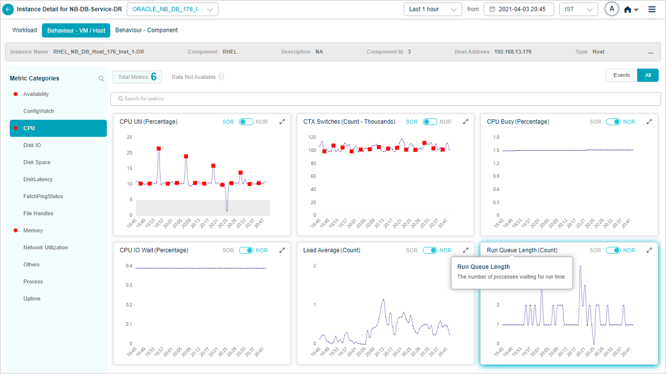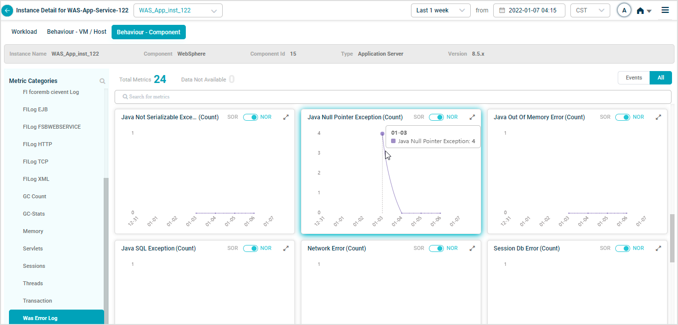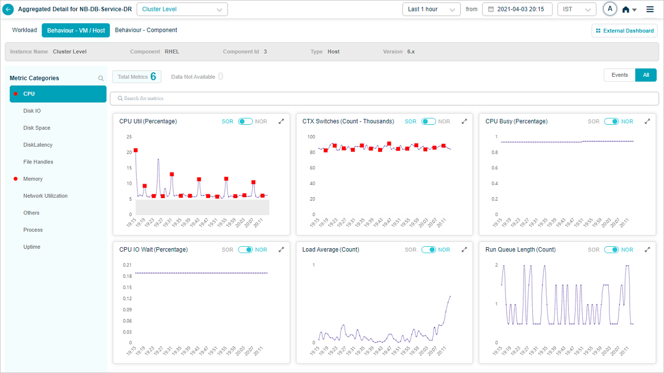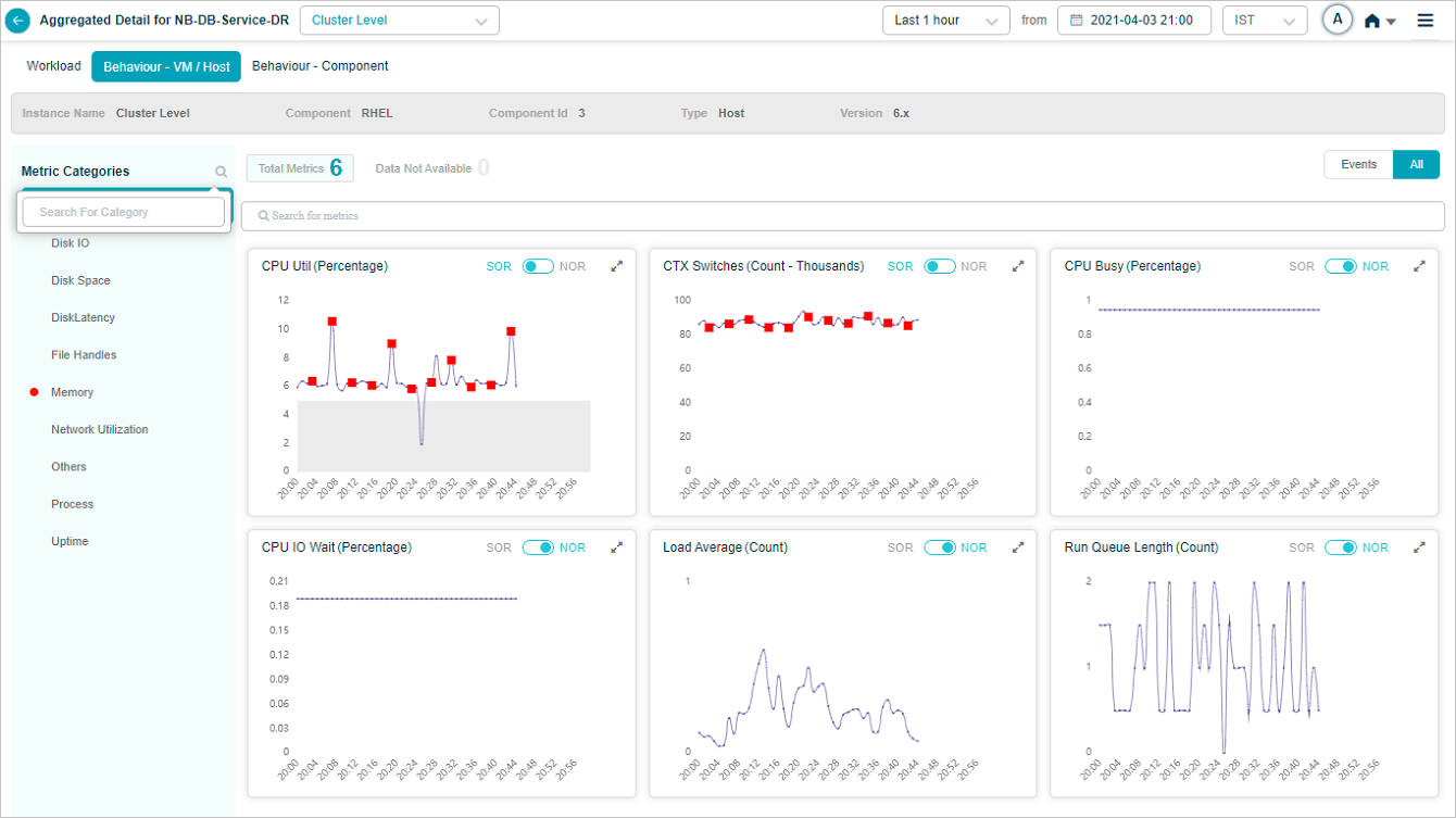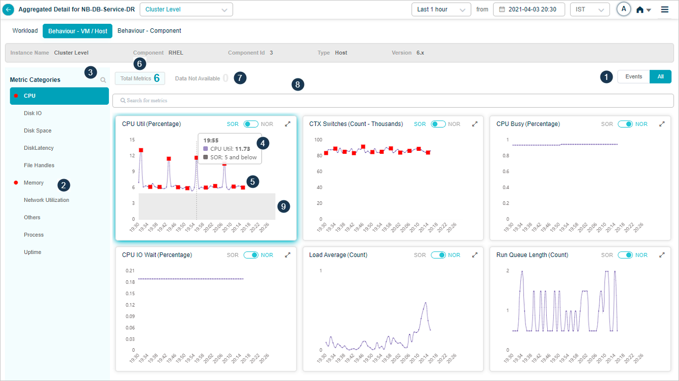 2 All service behavior-related metrics are available here, arranged by categories. A Red circle is displayed next to the category name if any event is generated for the category. The Amber circle is displayed next to Config Watch category if there are any configuration changes.