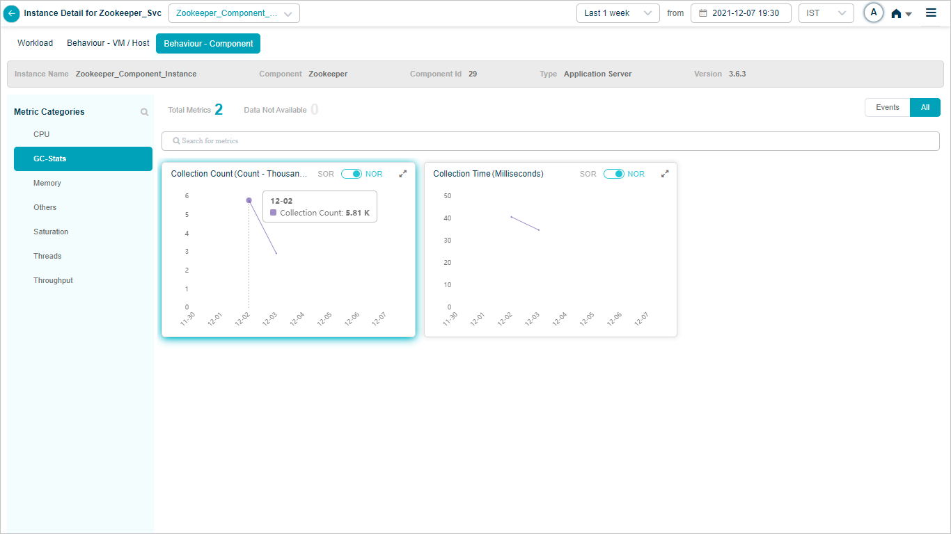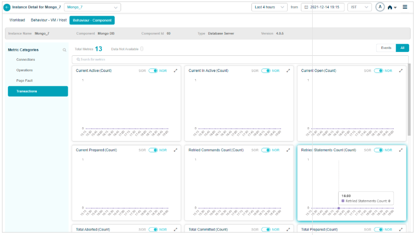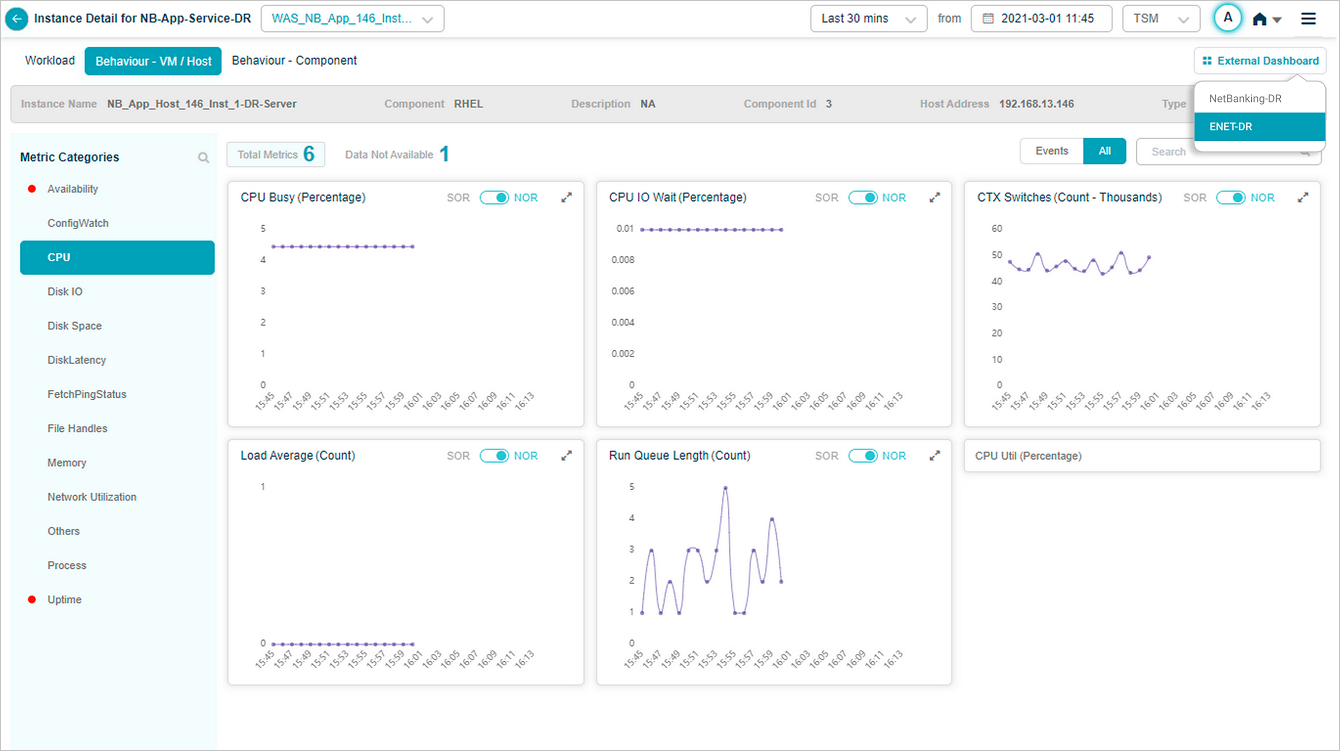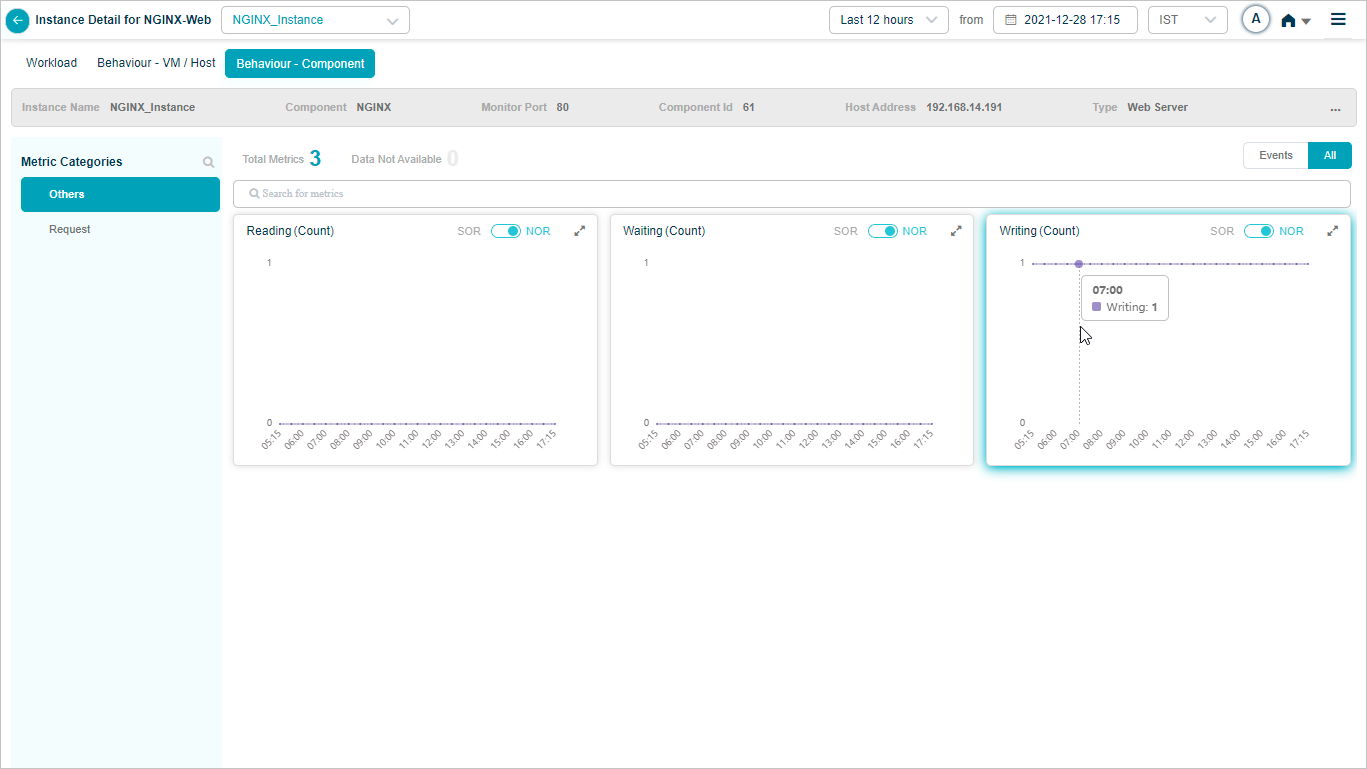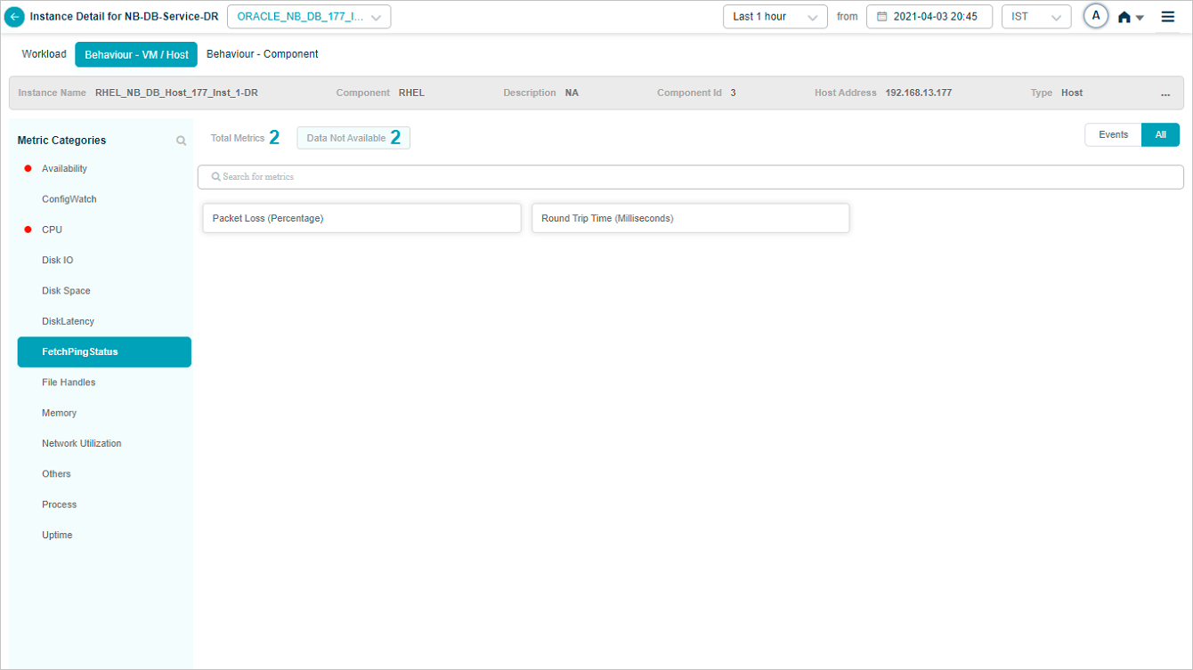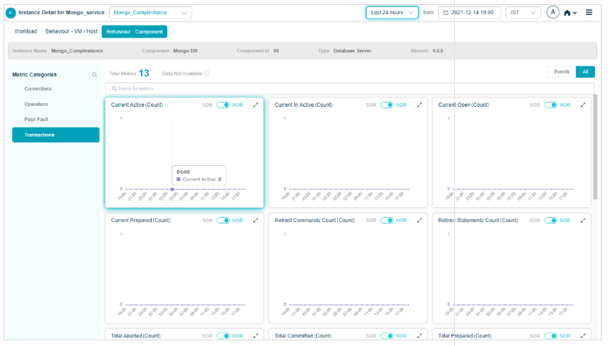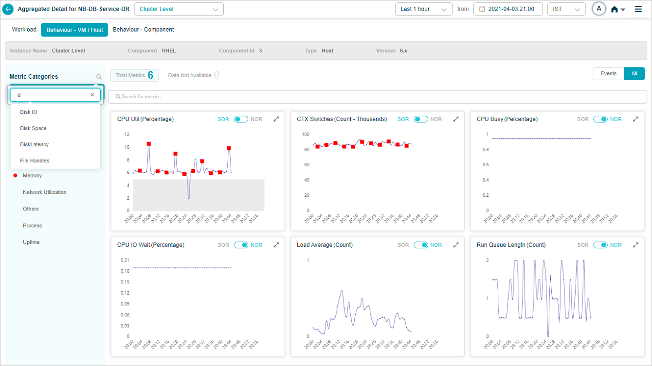 2 All service behavior-related metrics are available here, arranged by categories. A Red circle is displayed next to the category name if any event is generated for the category. The Amber circle is displayed next to Config Watch category if there are any configuration changes.