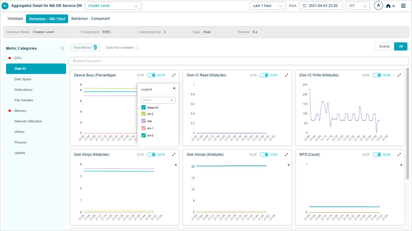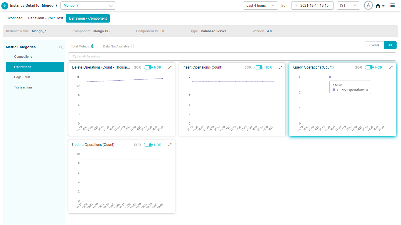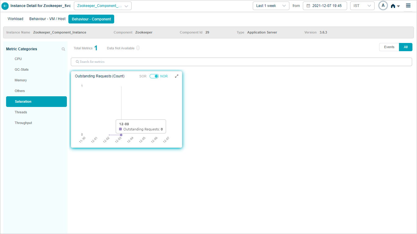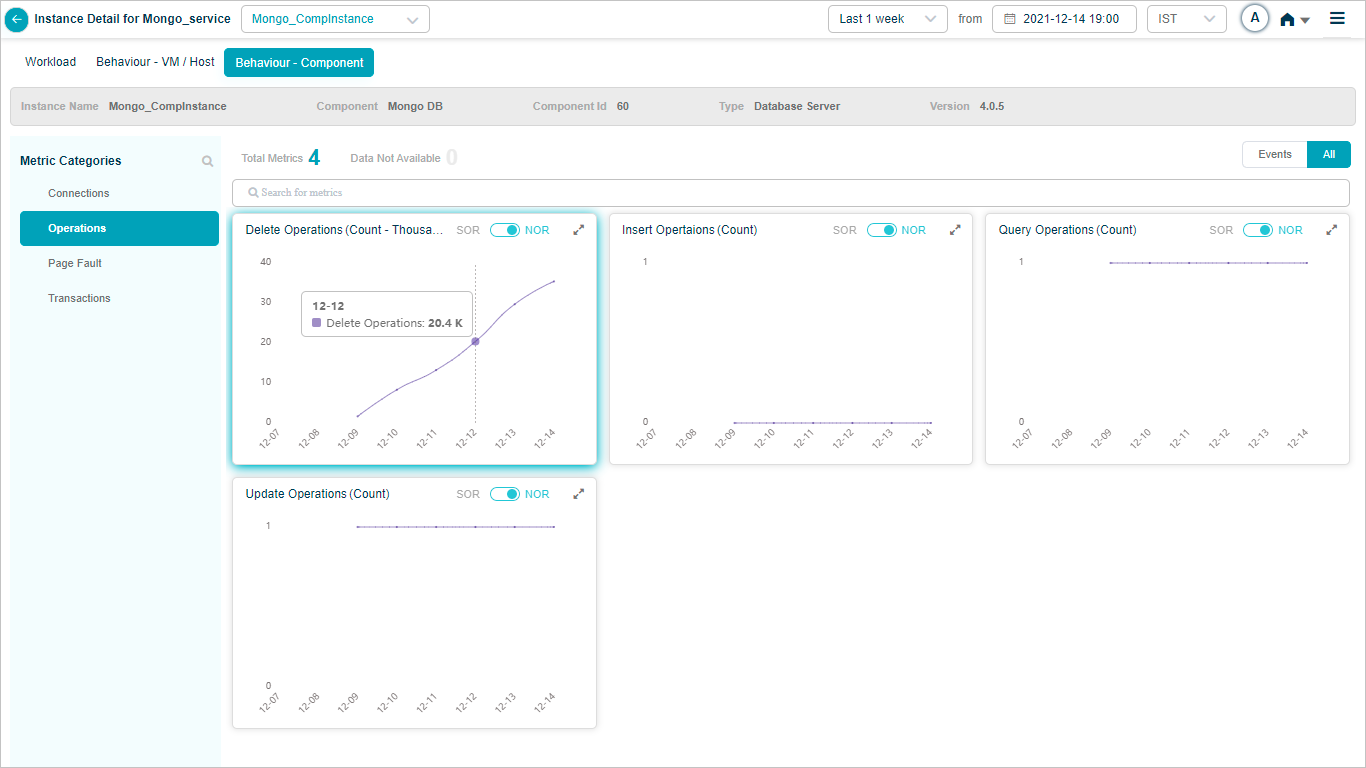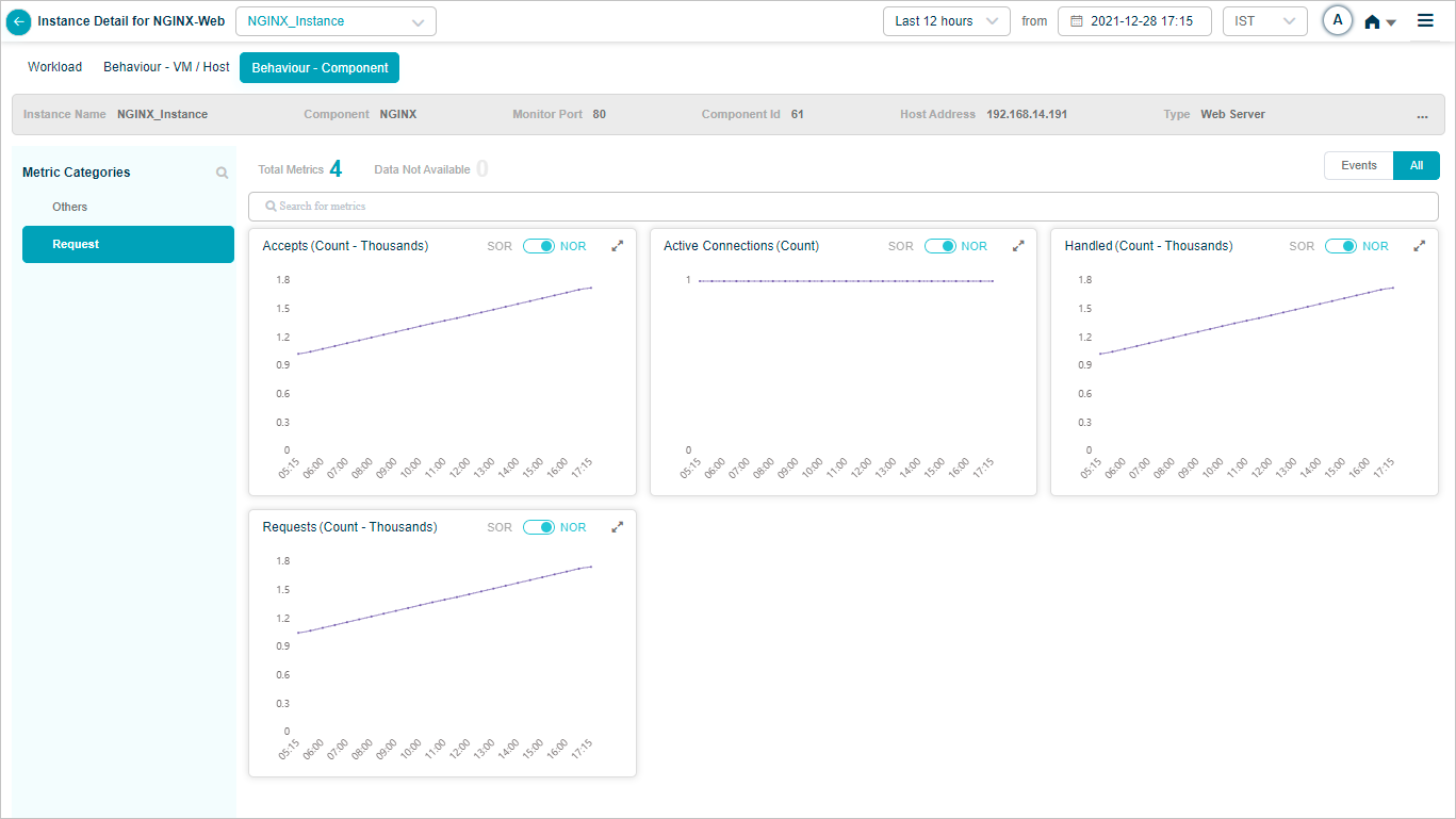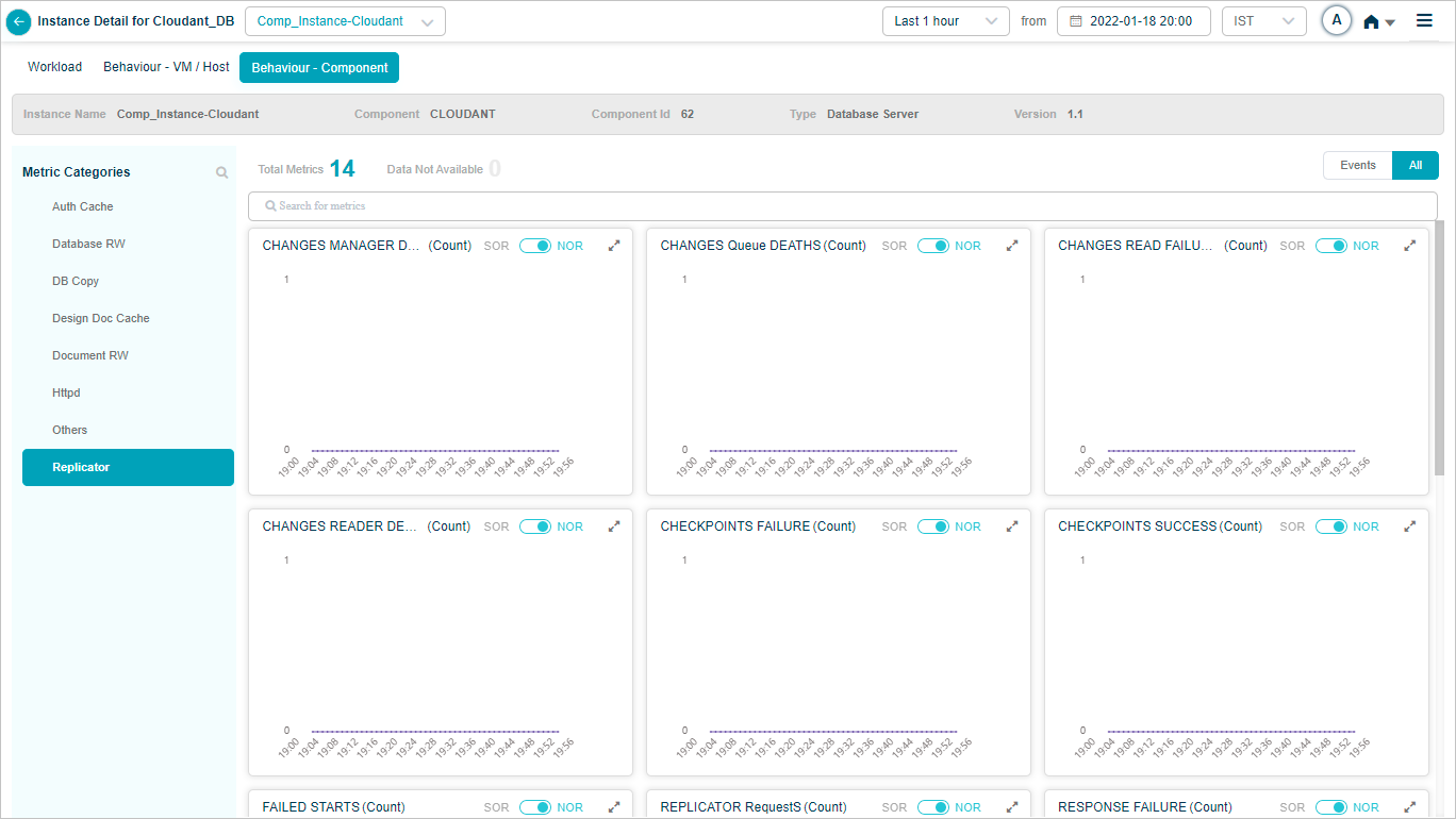 2 All service behavior-related metrics are available here, arranged by categories. A Red circle is displayed next to the category name if any event is generated for the category. The Amber circle is displayed next to Config Watch category if there are any configuration changes.