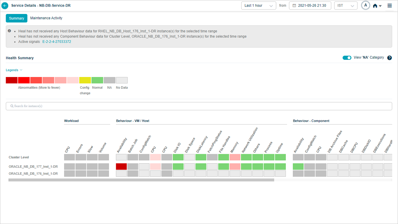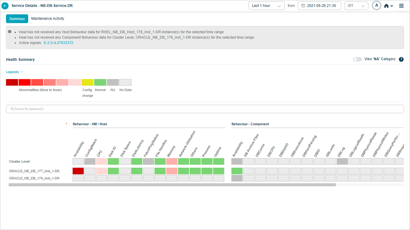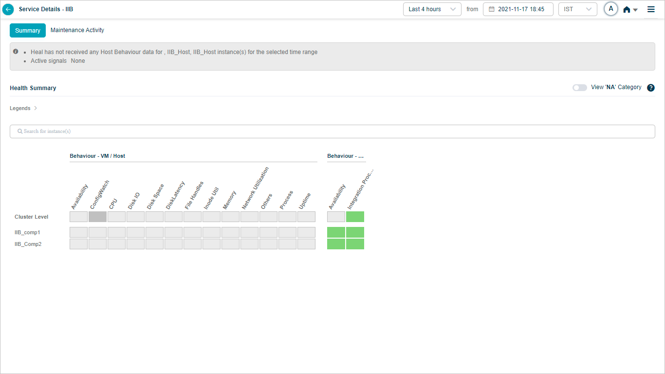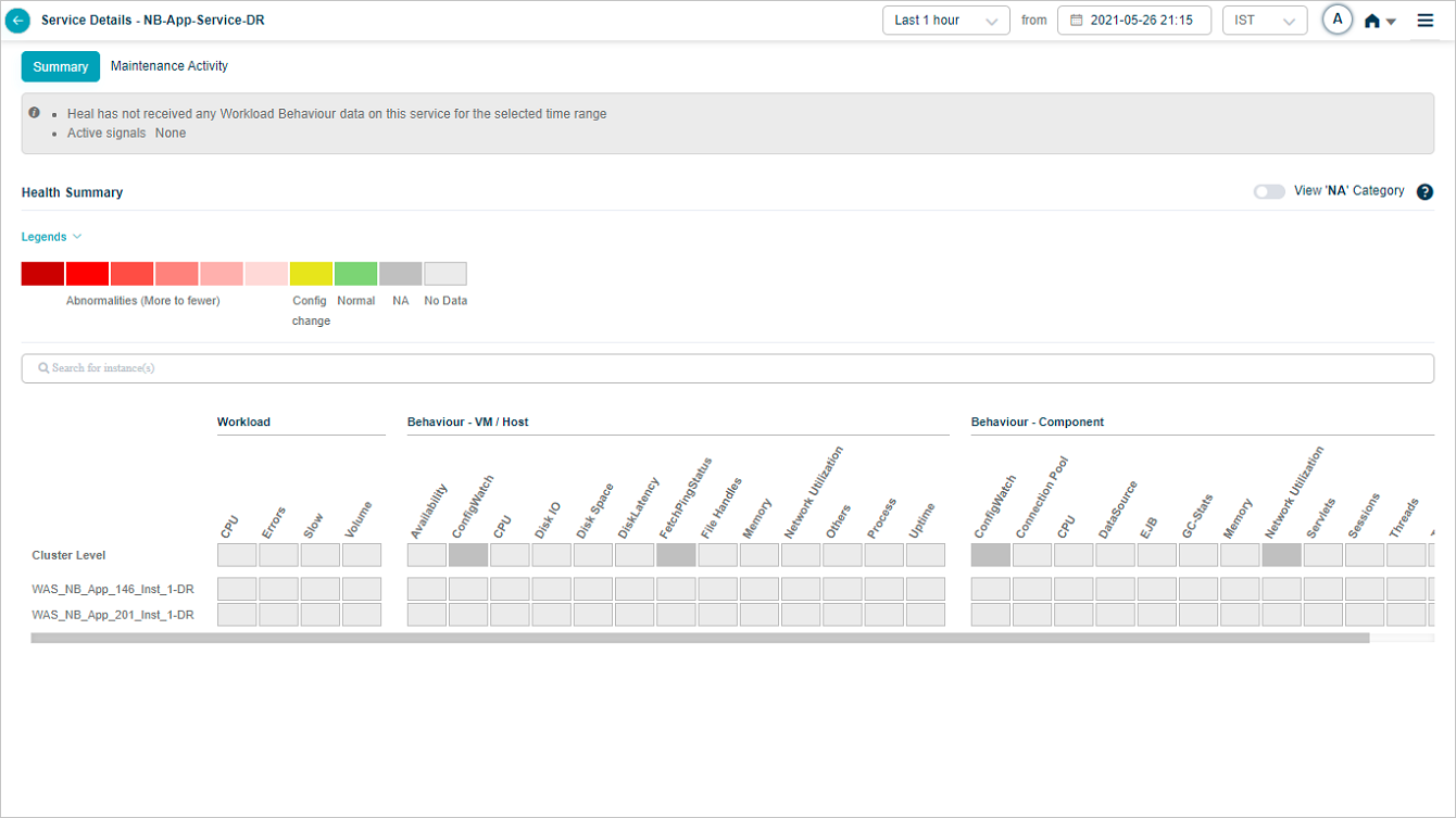 2, 3 Instances and KPI categories are listed in alphabetical order. You can create a service with host instances only. Refer Service Creation. In this case, only host instances are listed in the heat map with cluster on top. You can see a message “No component instance is mapped to this service”. Instances with events are displayed before the instances without events. If multiple instances have events, these events are displayed in alphabetical order.