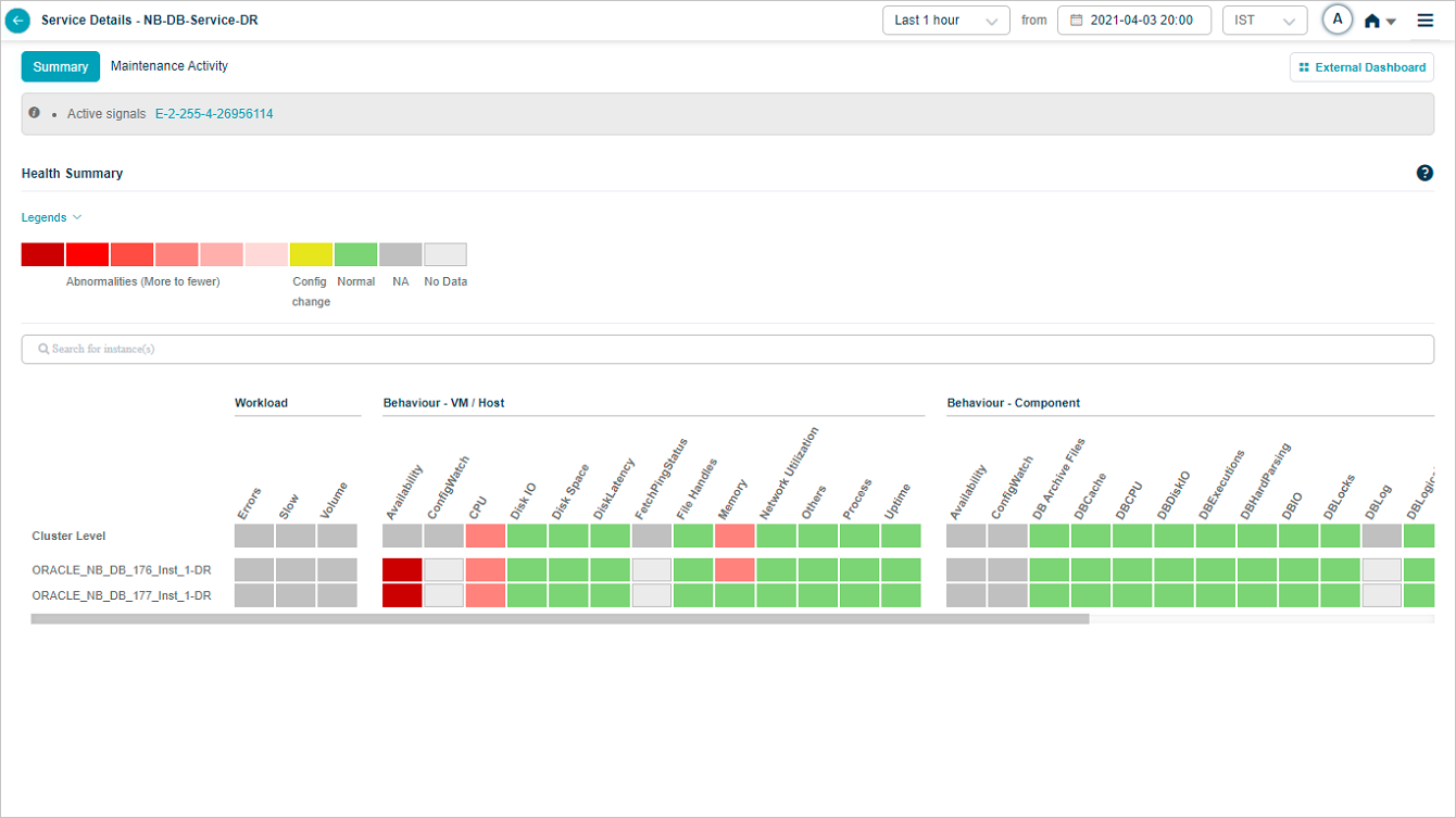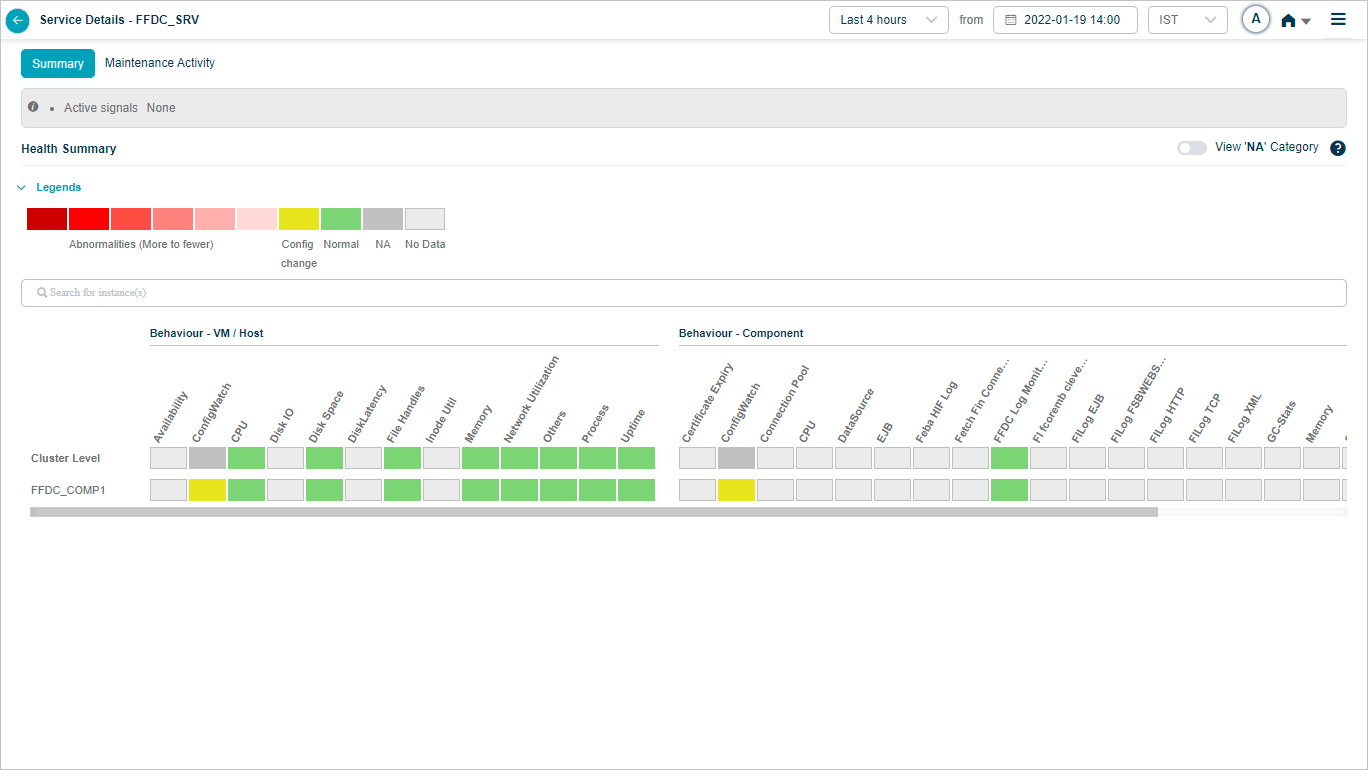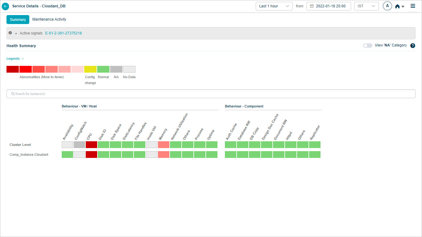 2, 3 Instances and KPI categories are listed in alphabetical order. You can create a service with host instances only. Refer Service Creation. In this case, only host instances are listed in the heat map with cluster on top. You can see a message “No component instance is mapped to this service”. Instances with events are displayed before the instances without events. If multiple instances have events, these events are displayed in alphabetical order.