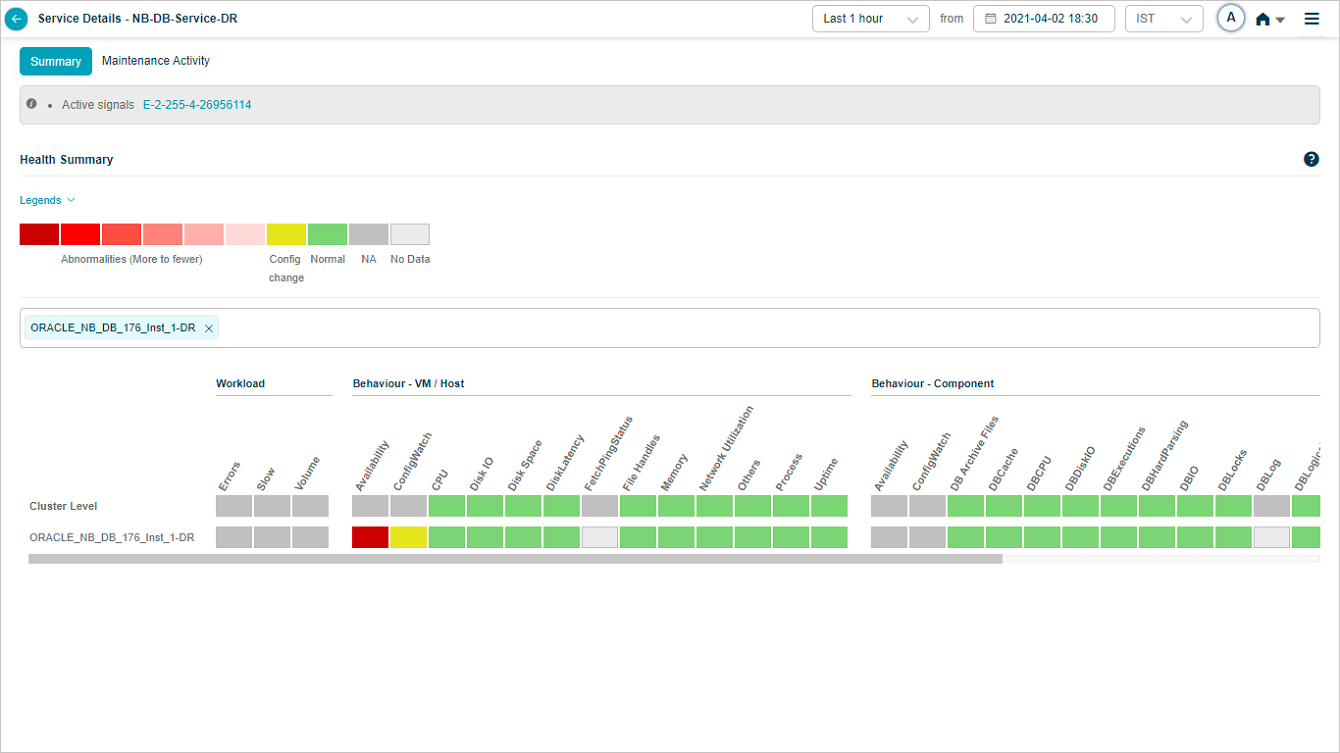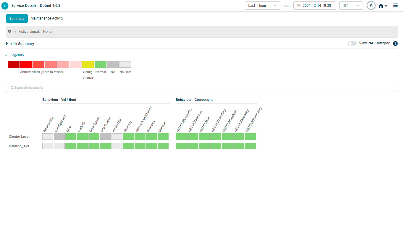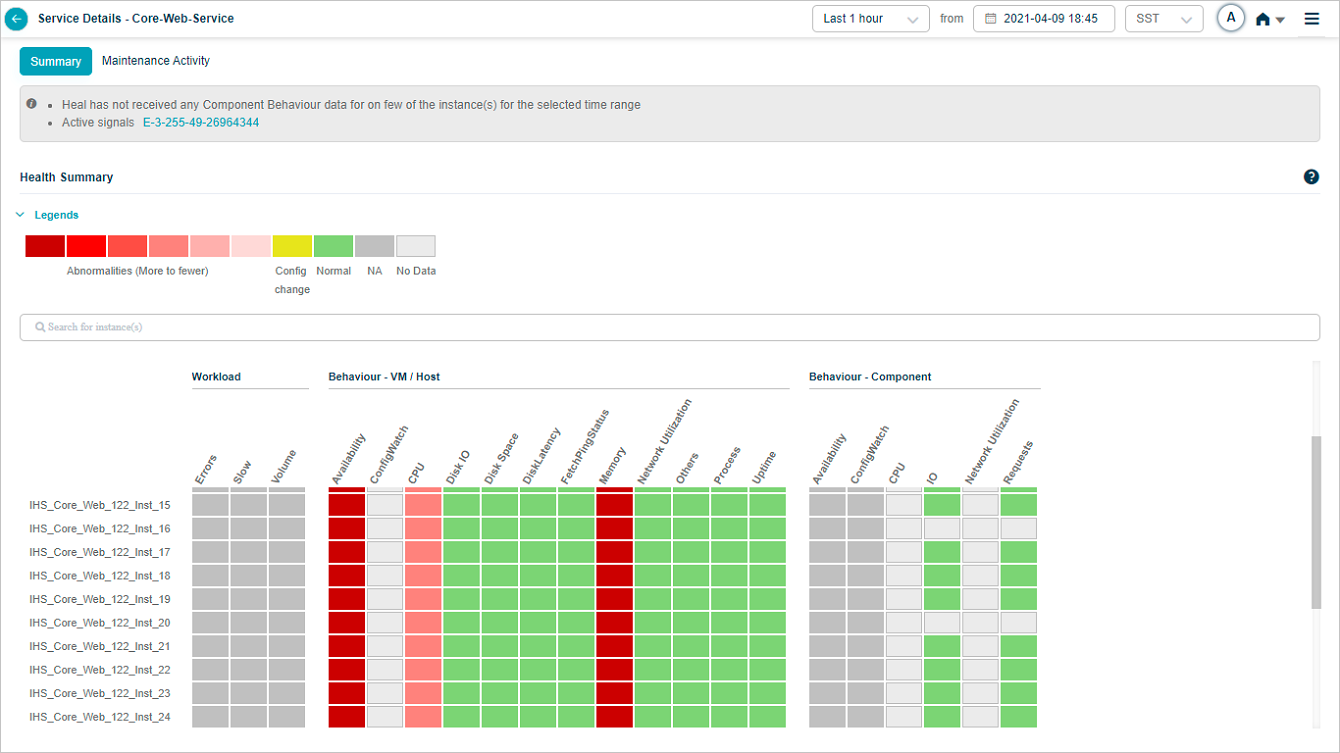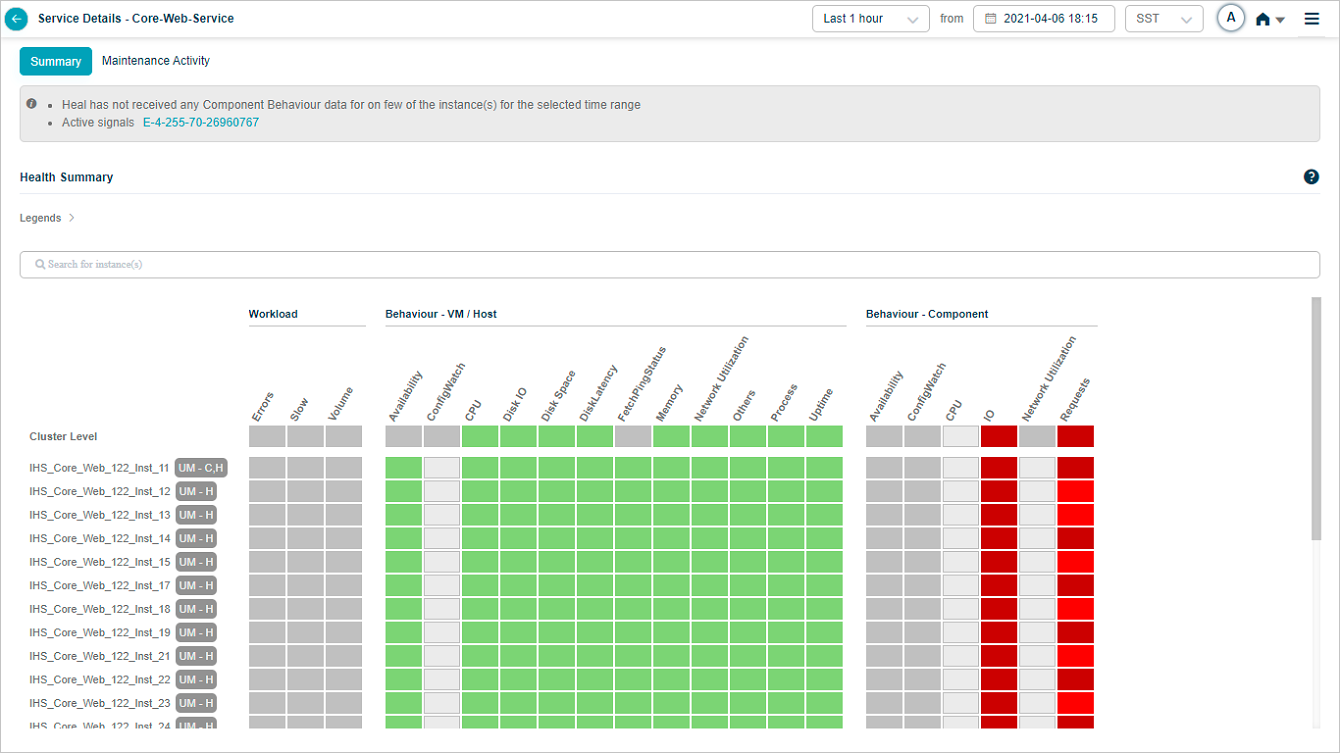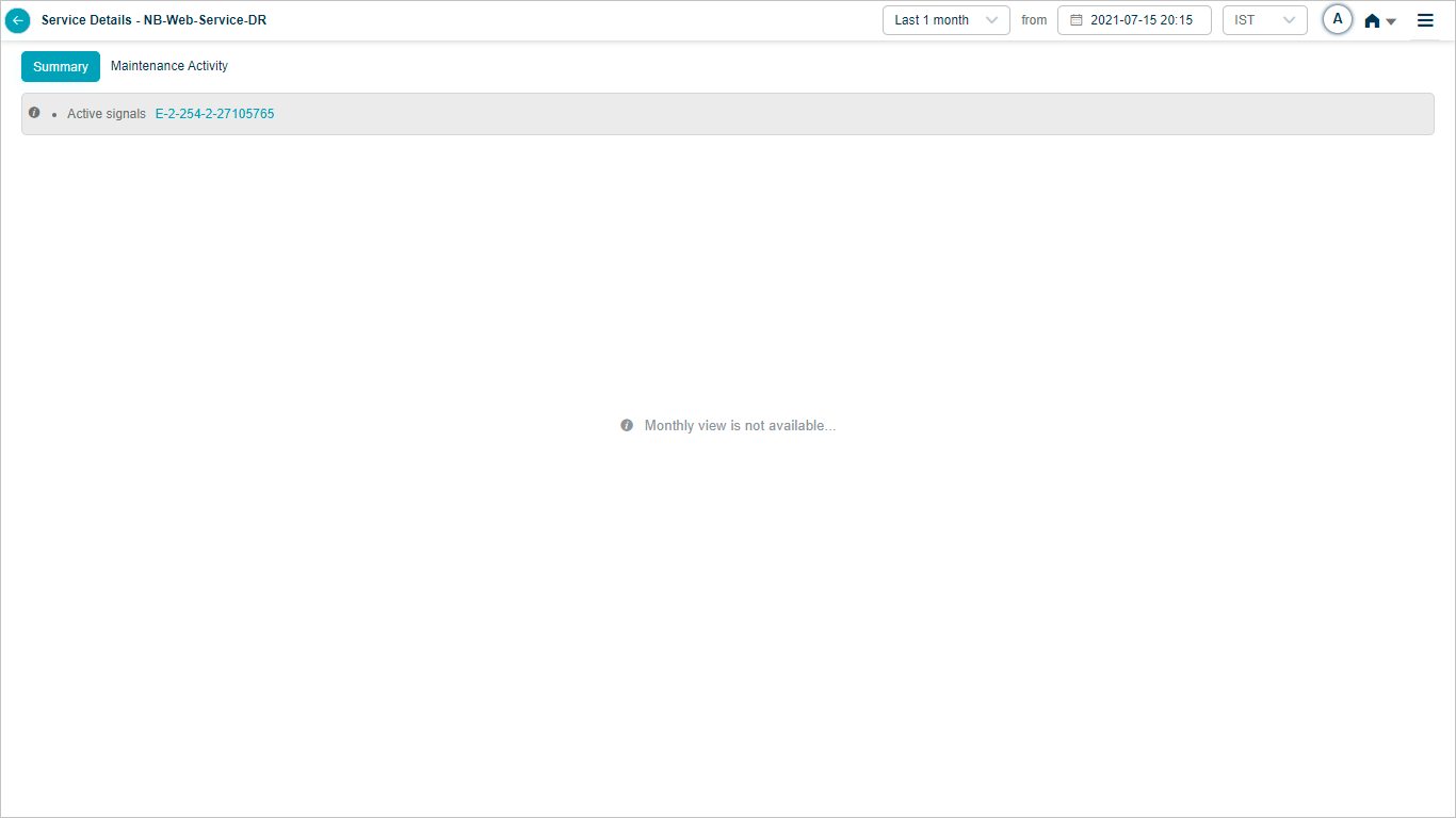 When a service is under maintenance, collected data is processed and stored in the database. Service Heat Map displays the blocks in green when there are no events and data is available. Heat Map displays blocks in light grey color when data is not collected. Data is not used to generate events via SOR or NOR. Signals are not generated during this time period. If a Signal is open just before the maintenance window period begins, it is closed if all the services under the Signal are under maintenance. If only one service out of many in a Signal is under maintenance, then the Signal is not closed. If you select a time range in which the service is under maintenance, in the service details screen, the Heat Map displays the UM icon in Summary section.