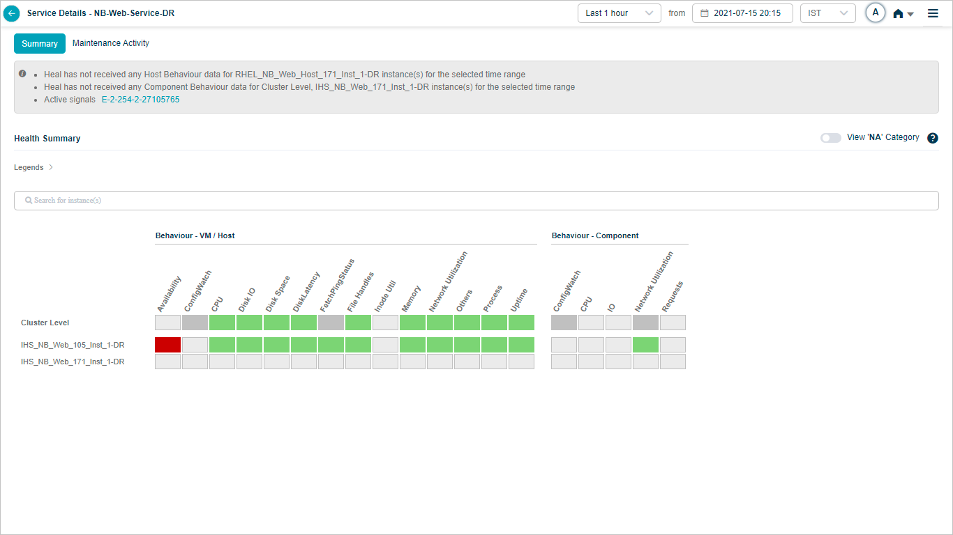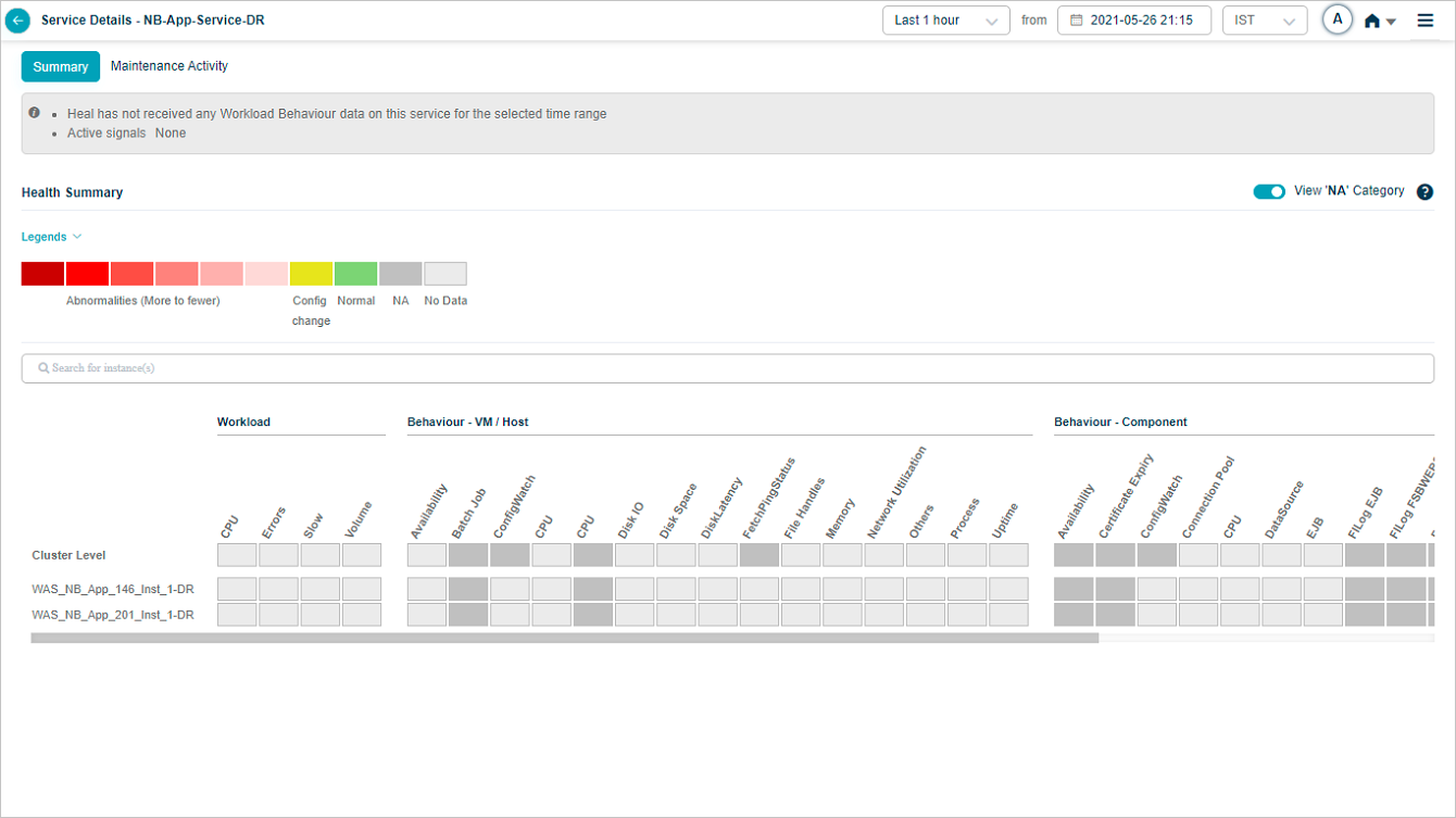 HEAL hides NA categories by default. Turn ON the slider to view the categories with all the KPIs at cluster and instance level as NA.