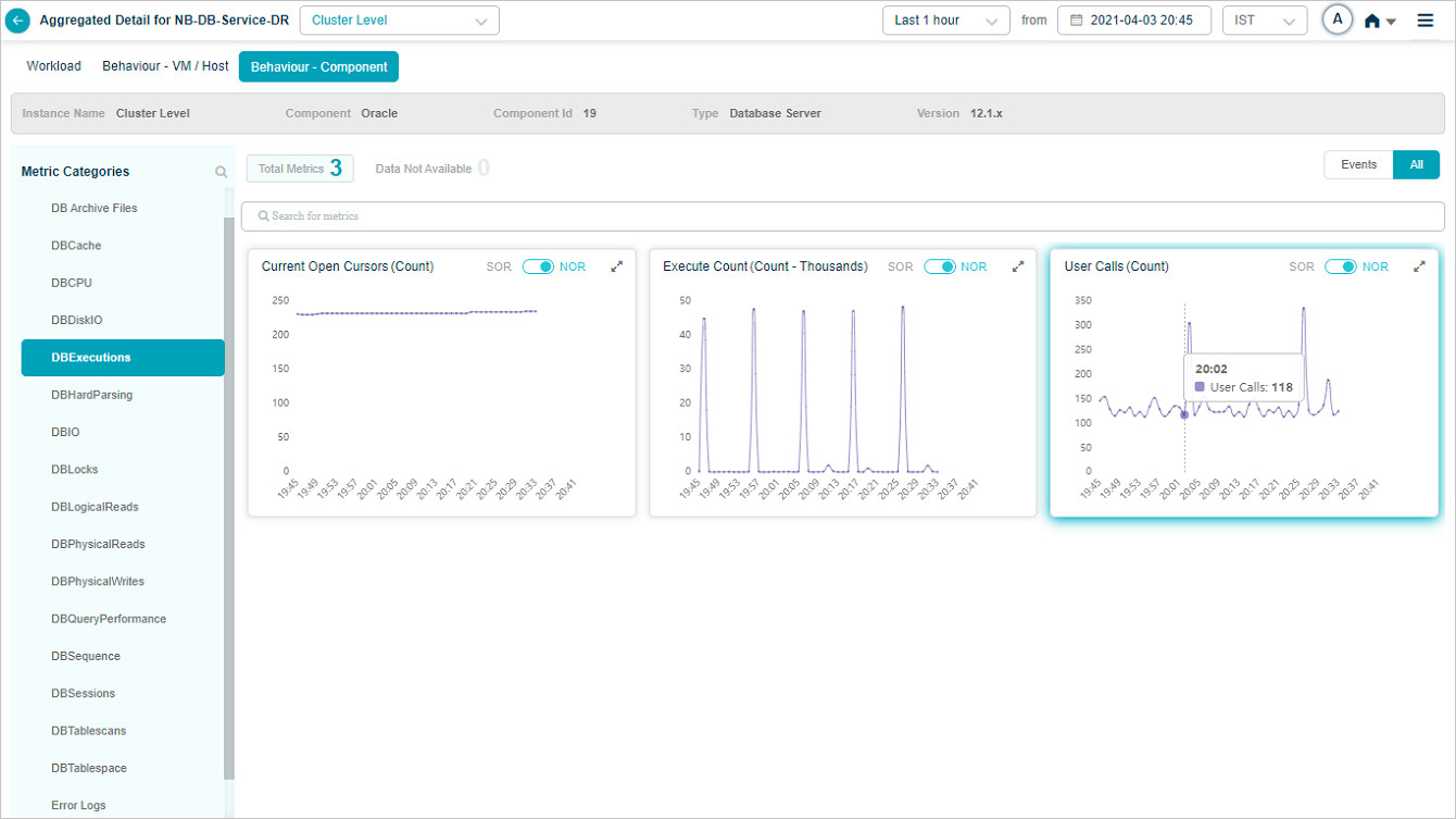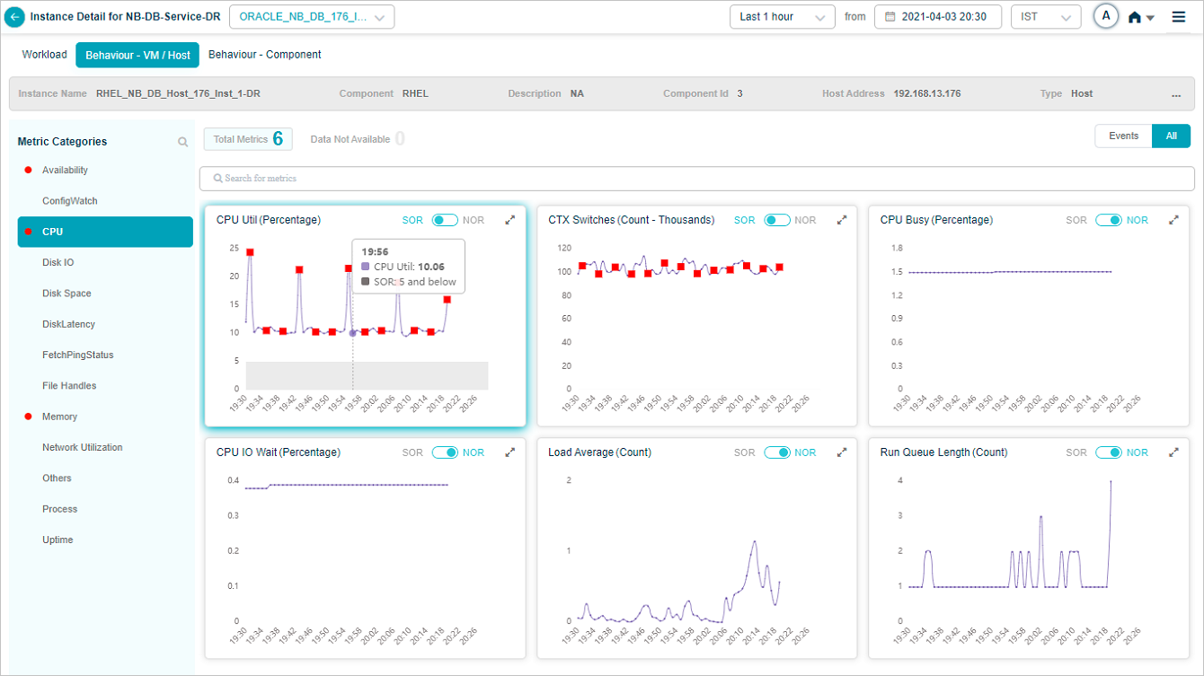 4 Hover on the dots to see KPI value for that time interval. This displays time instance in the top. Value indicates the actual KPI value at that time instance. Normal operating range (NOR) is defined by MLE. Admin can define Static Operating Range (SOR) using Control Center.