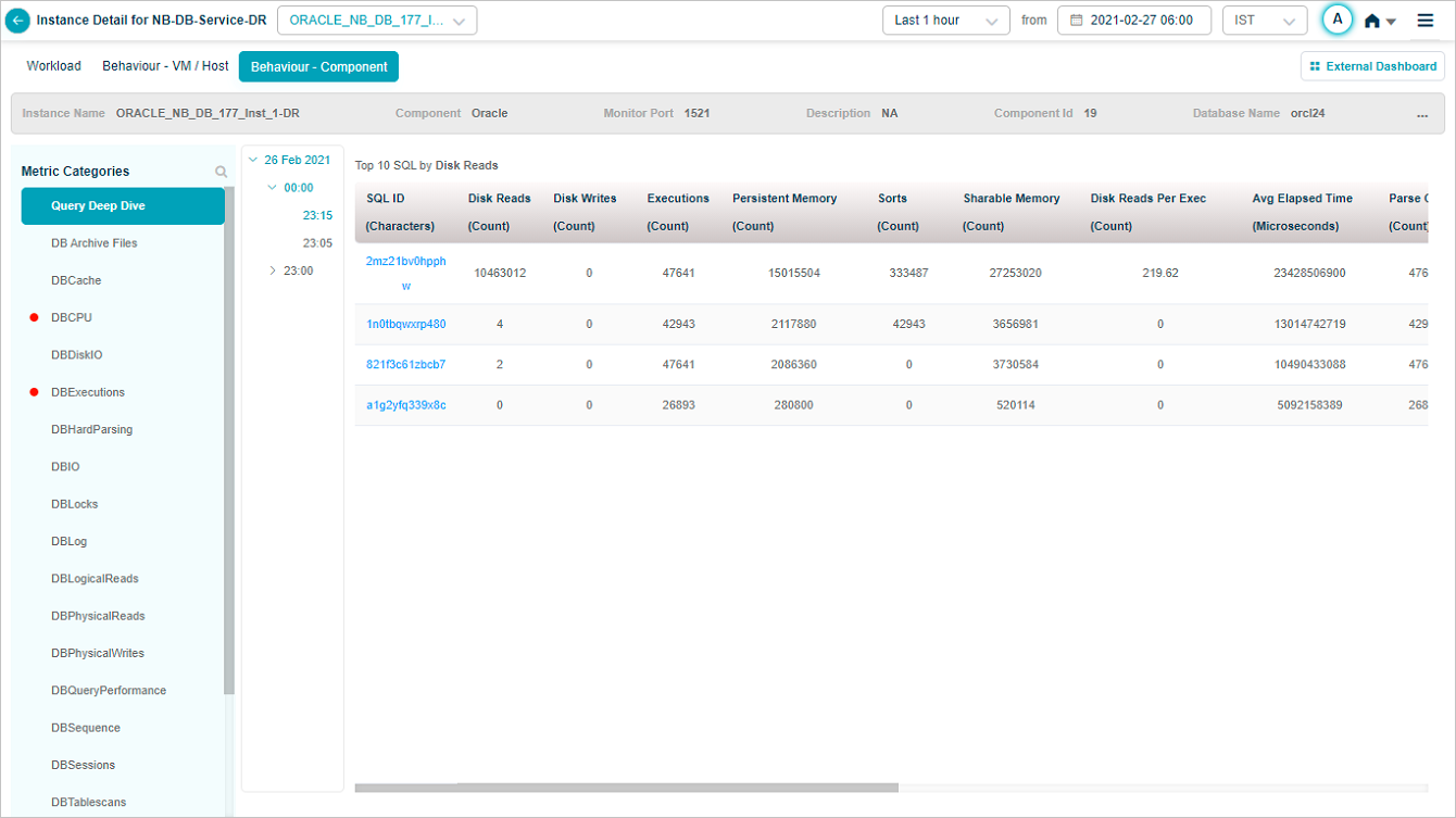 HEAL monitors databases to the extent of SQL queries in the deep dive section of the database service heat map. HEAL monitors and stores all the top slow running queries that are consuming resources in the database under this section.
