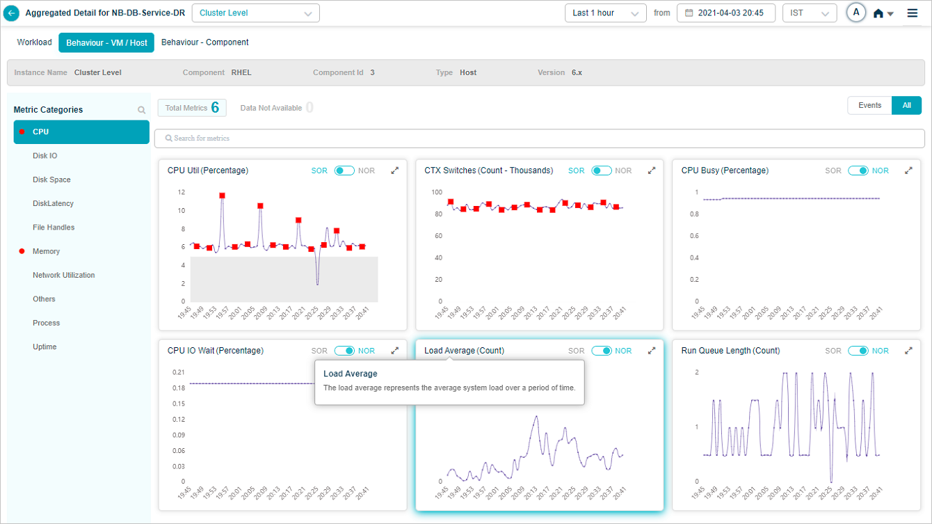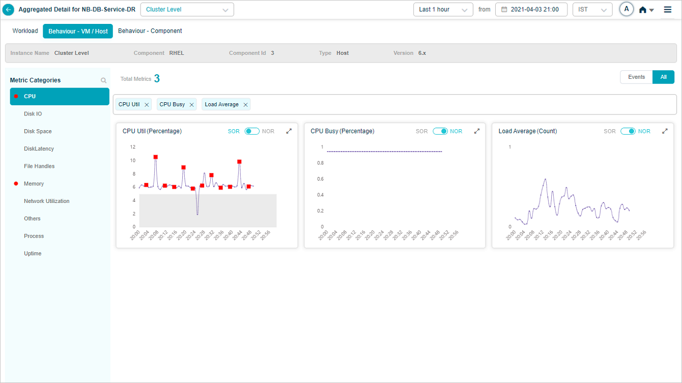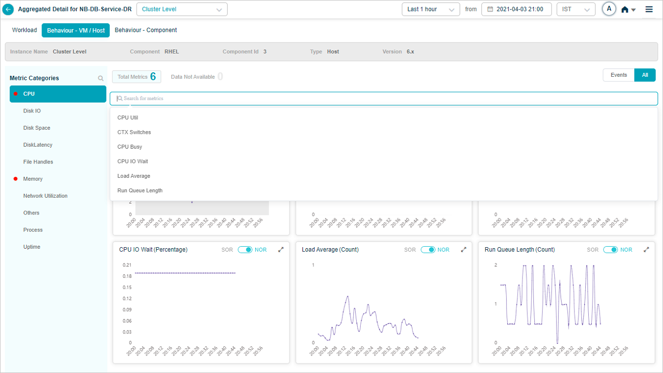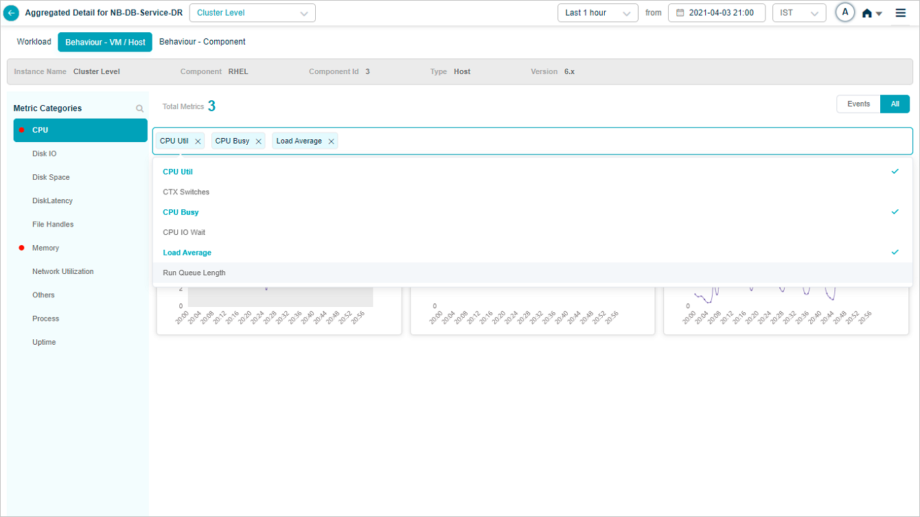 Select on a KPI category in overview heat map to bring up the metrics related to that KPI category. On select of CPU category at cluster or instance level displays this screen. It brings up CPU related metrics.