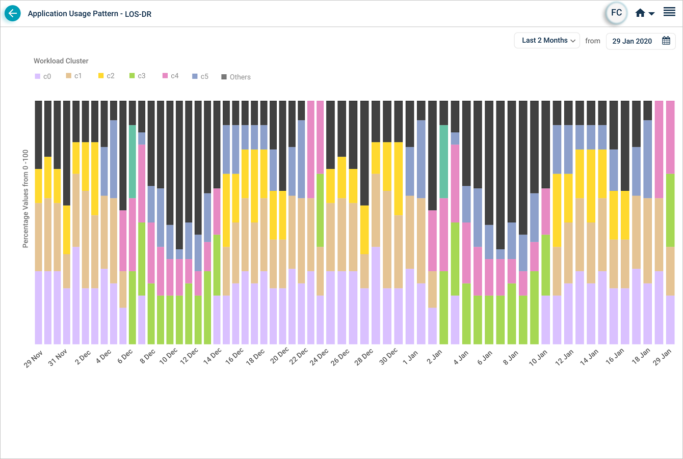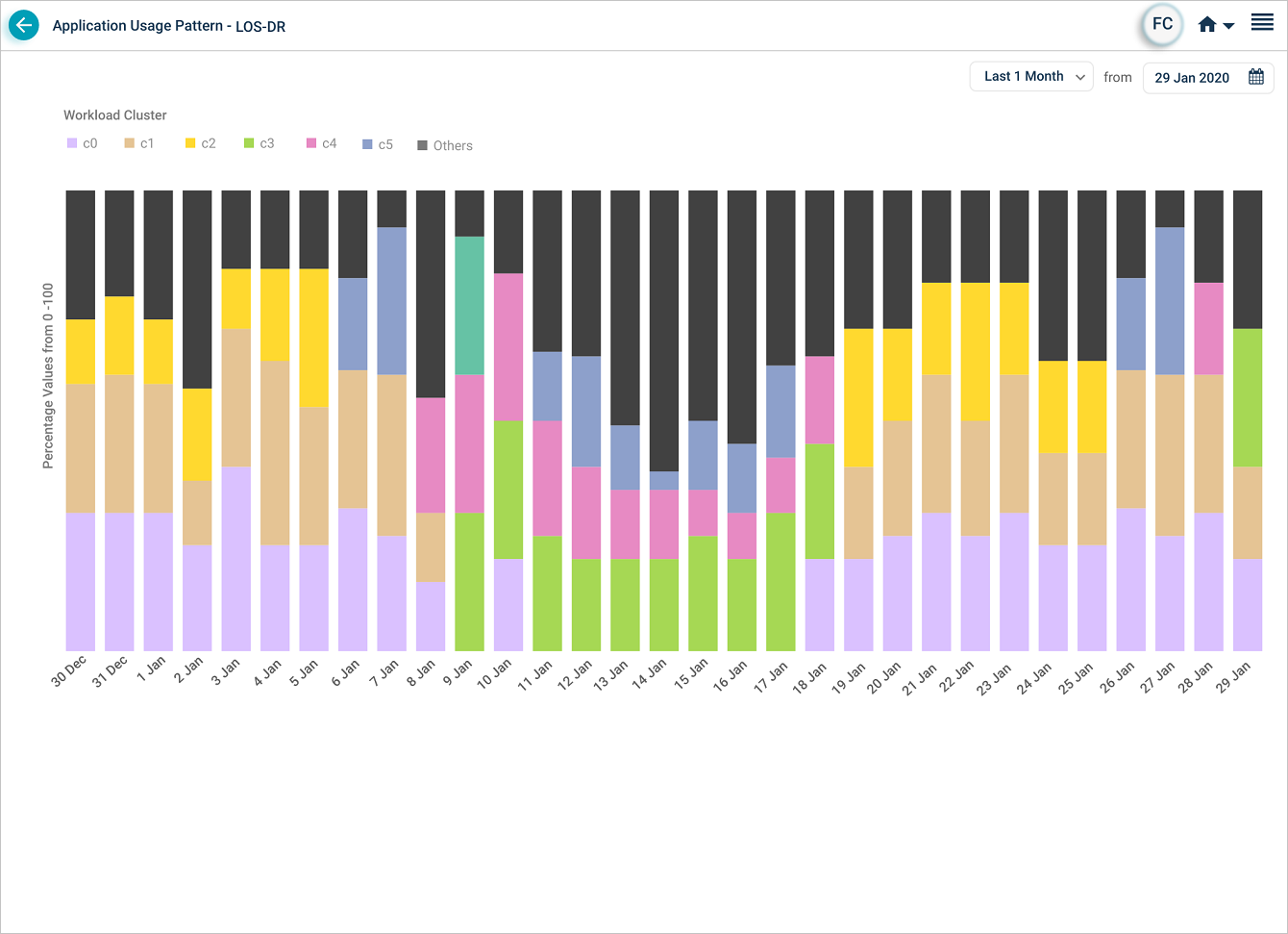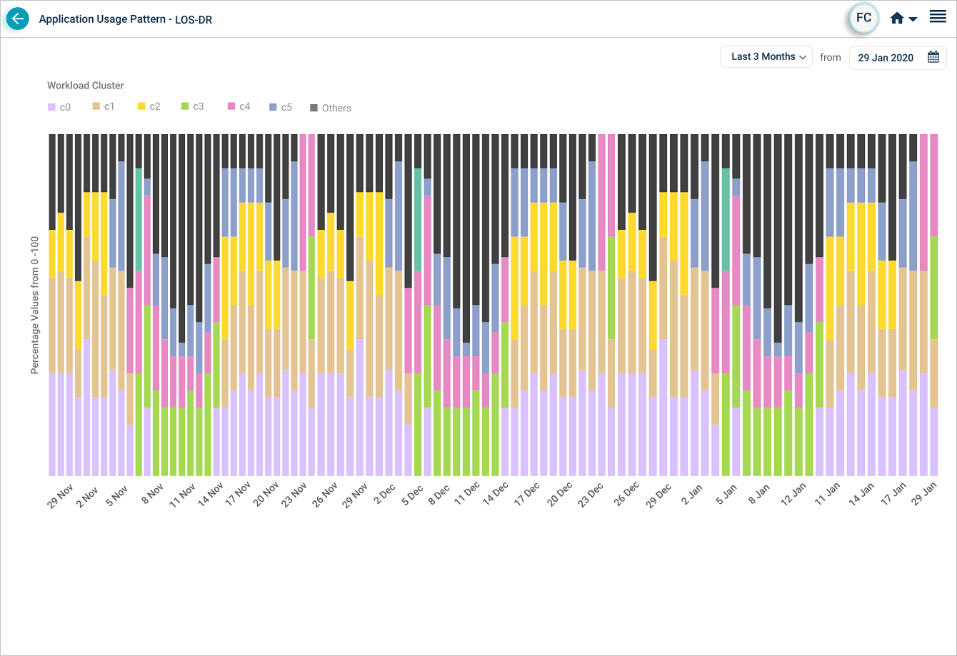 HEAL showcases the application usage pattern in terms of workload cluster composition for a given time period. You can select the time period between 1 day, 1 week, 1, 2, or 3 months. HEAL displays the top three workload cluster compositions and the rest of the compositions under ‘Others’. ‘Others’ is all clusters together except the top 3. With every MLE baseline, the number of clusters may vary.