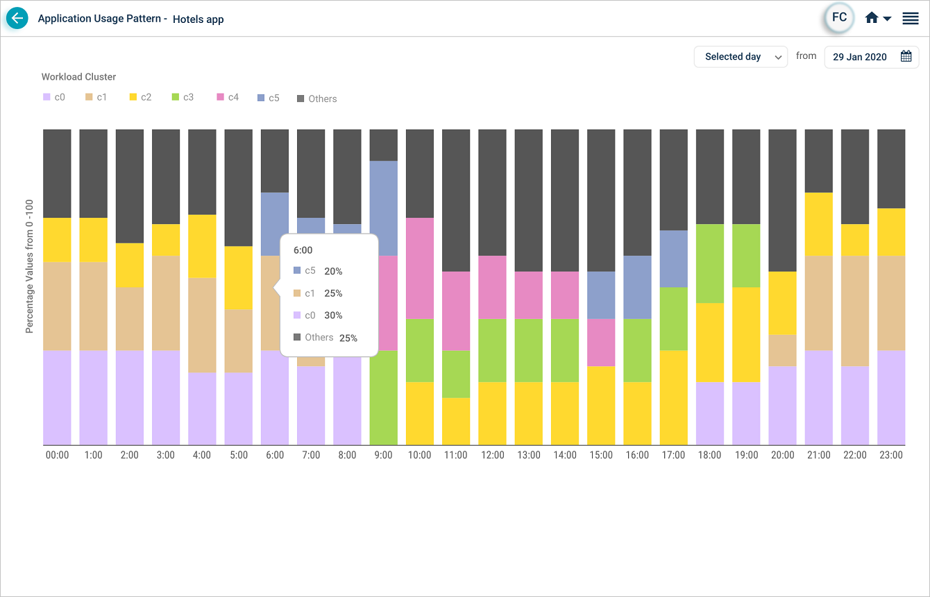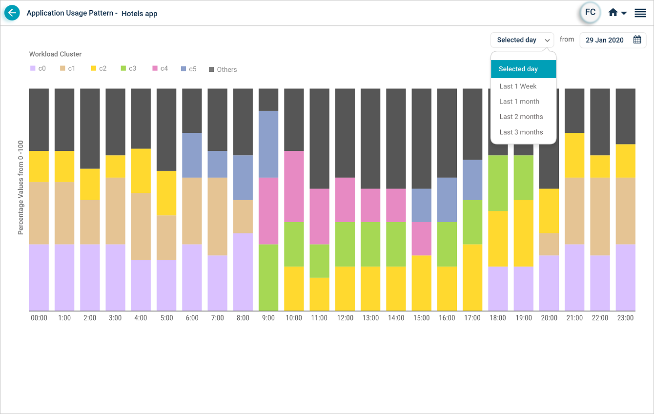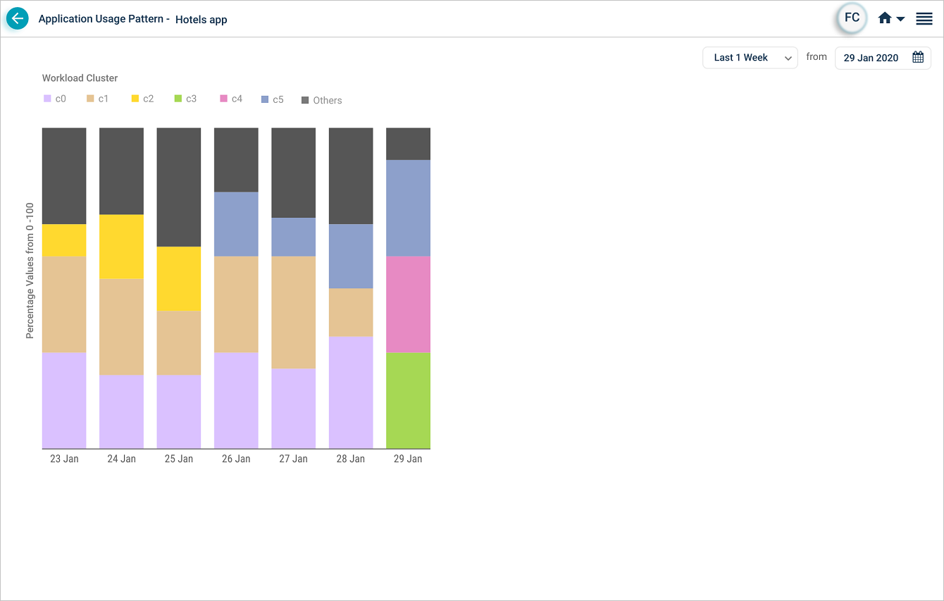 HEAL showcases the application usage pattern in terms of workload cluster composition for a given time period. You can select the time period between 1 day, 1 week, 1, 2, or 3 months. HEAL displays the top three workload cluster compositions and the rest of the compositions under ‘Others’. ‘Others’ is all clusters together except the top 3. With every MLE baseline, the number of clusters may vary.